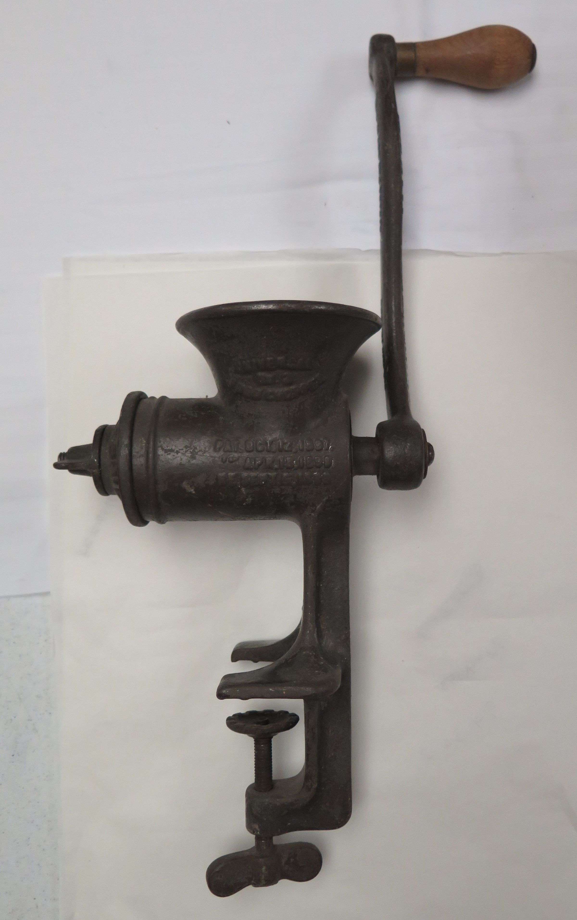 This cast metal food grinder measures 19"(H) x 10"(W) x 5"(D). It has several parts including two cutting blades.