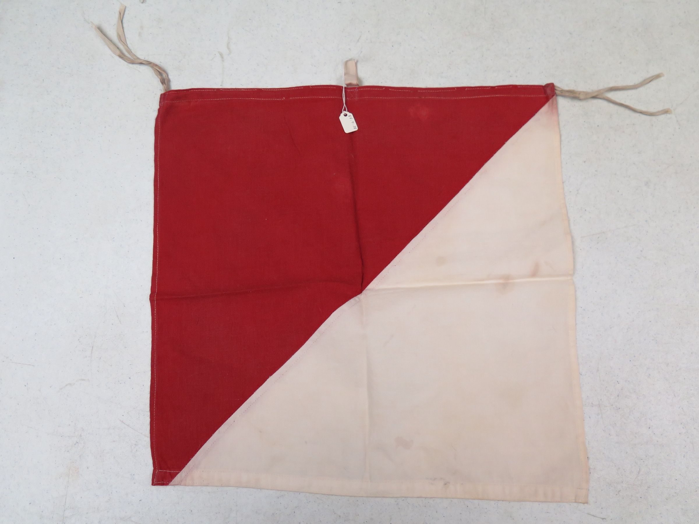 This is a signal flag that is half red and half white, split diagonally through the center. The flag has 2 strands of white material coming off either of the top corners. The flag measures 16" (w) x 16" (l).