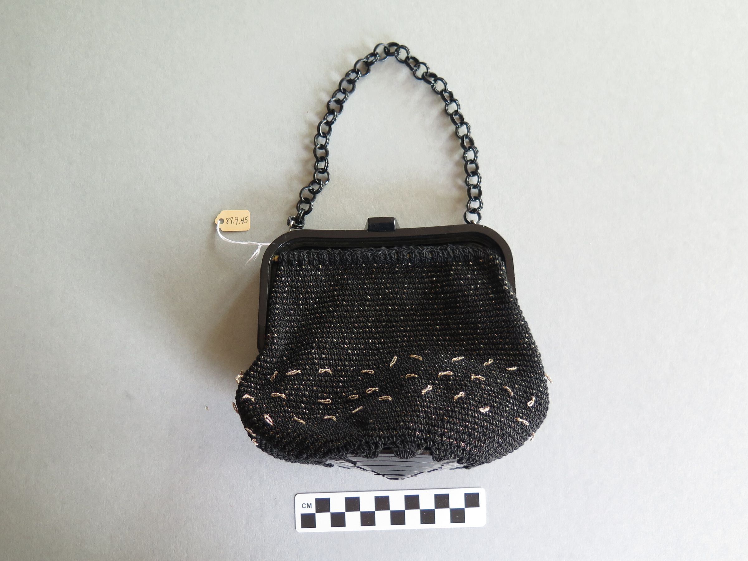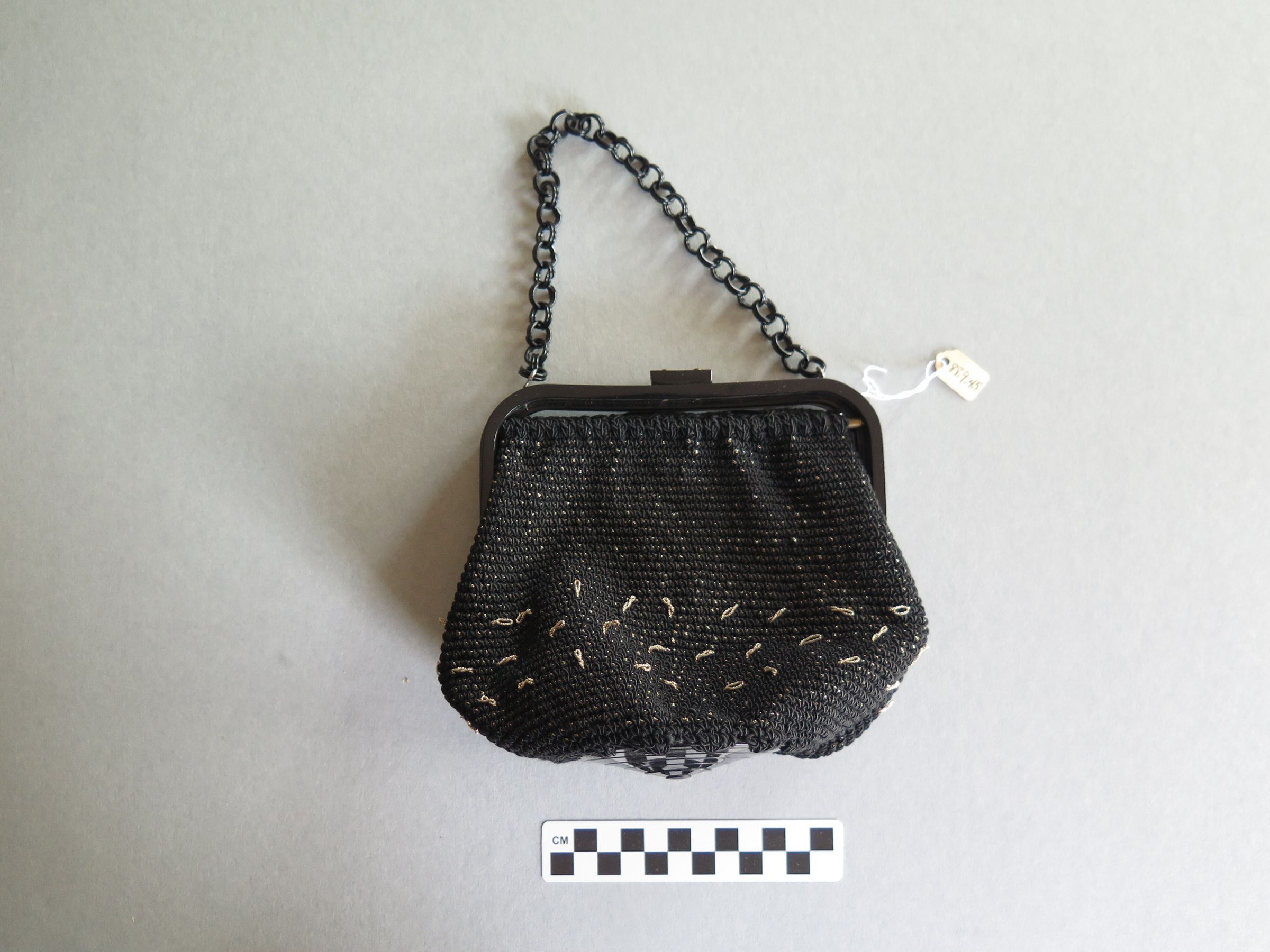 Black and gold crocheted women's purse. The purse clasps shut at the top and has a chain handle. Purse measures 6" (w) x 7" (l).
