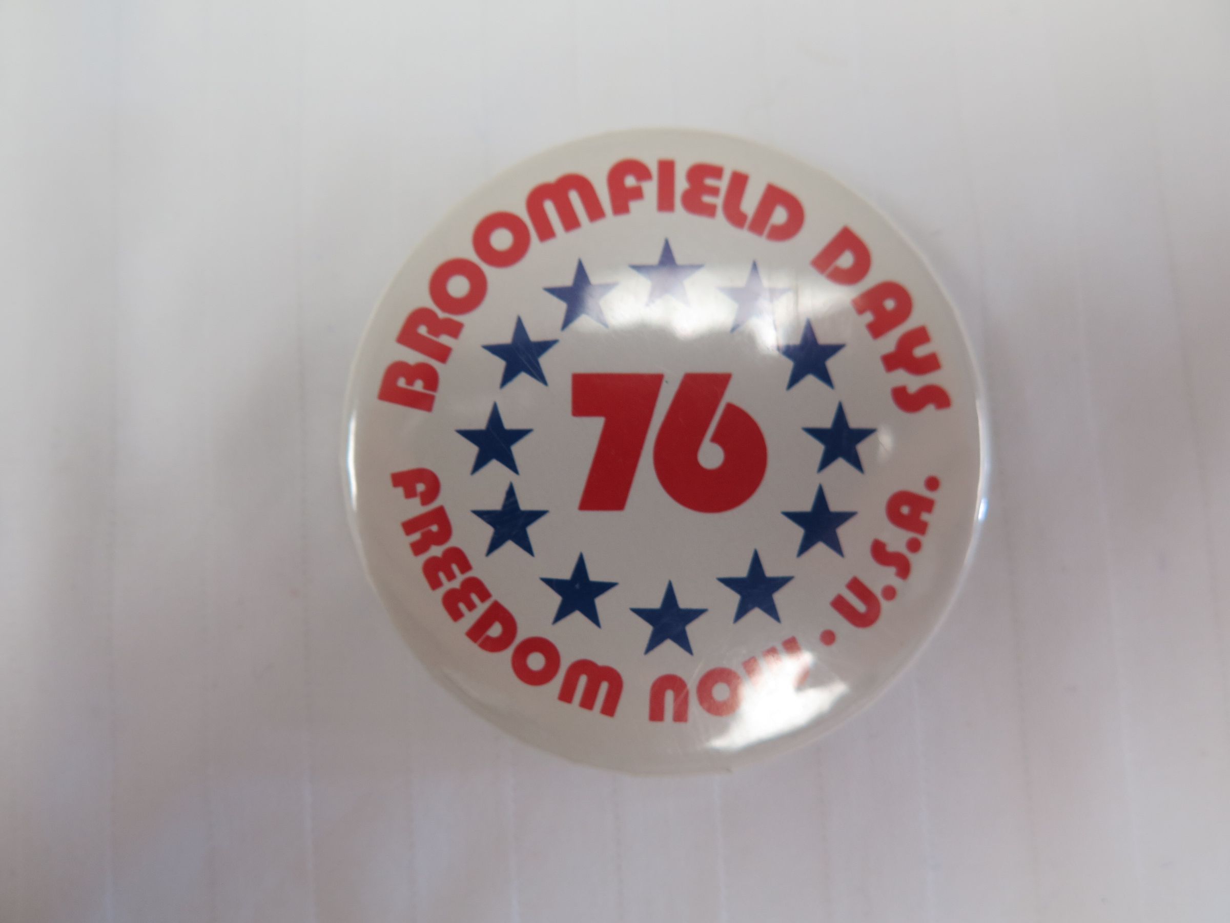 This is a round button from Broomfield Days Bicentennial. The button is white with blue stars and red text that reads, "Broomfield Days/ Freedom Now U.S.A./ 76". The button measures 2.25" (dia).Collection