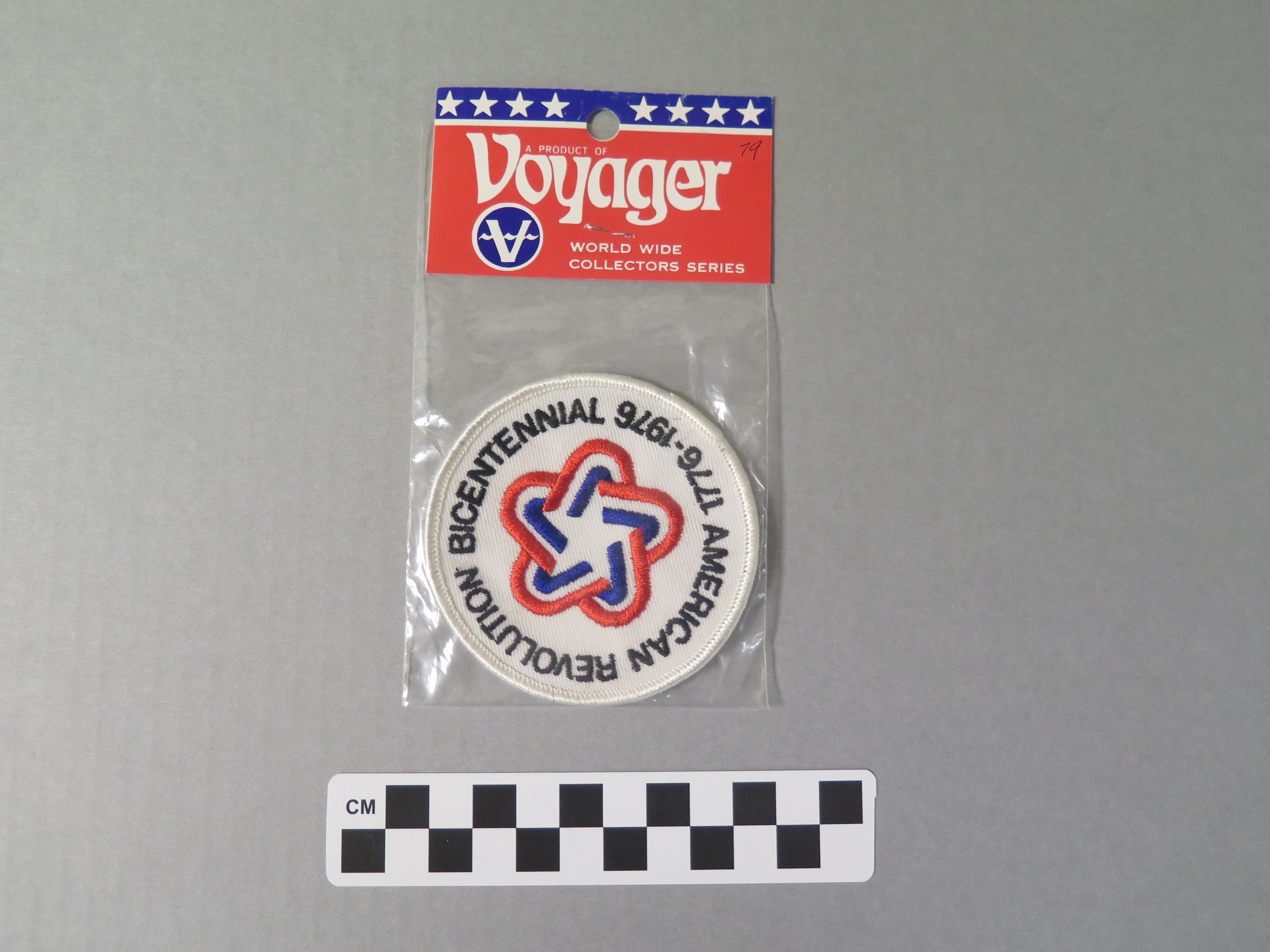 This is a Bicentennial sew-on patch in the original packaging. The packaging is a plastic bag with a cardboard label staples to the top. The label is red with a stripe of blue along the top that has white stare in it. The text on the label is printed in white text that reads, "A PRODUCT OF/ Voyager/ WORLD WIDE COLLECTORS SERIES" on the front and "VOYAGER EMBLEMS INC./ P/O/ BOX 512/ SANBORN, N. Y./ 14132" on the back. The patch is white with a red and blue star in the middle and the text "AMERICAN REVOLUTION BICENTENNIAL 1776-1976" in black thread around the outside. The package measures 3.5" (w) x 6" (l). The patch measures 3.5" (w) x 6" (l).