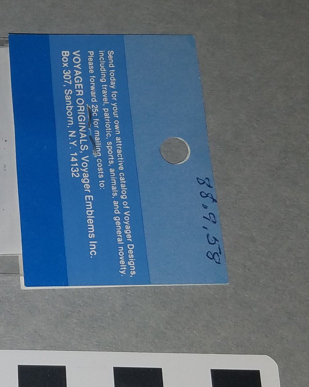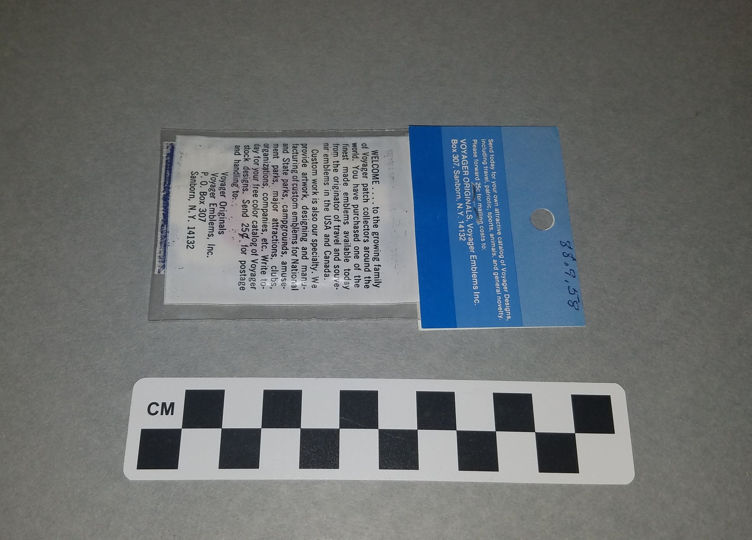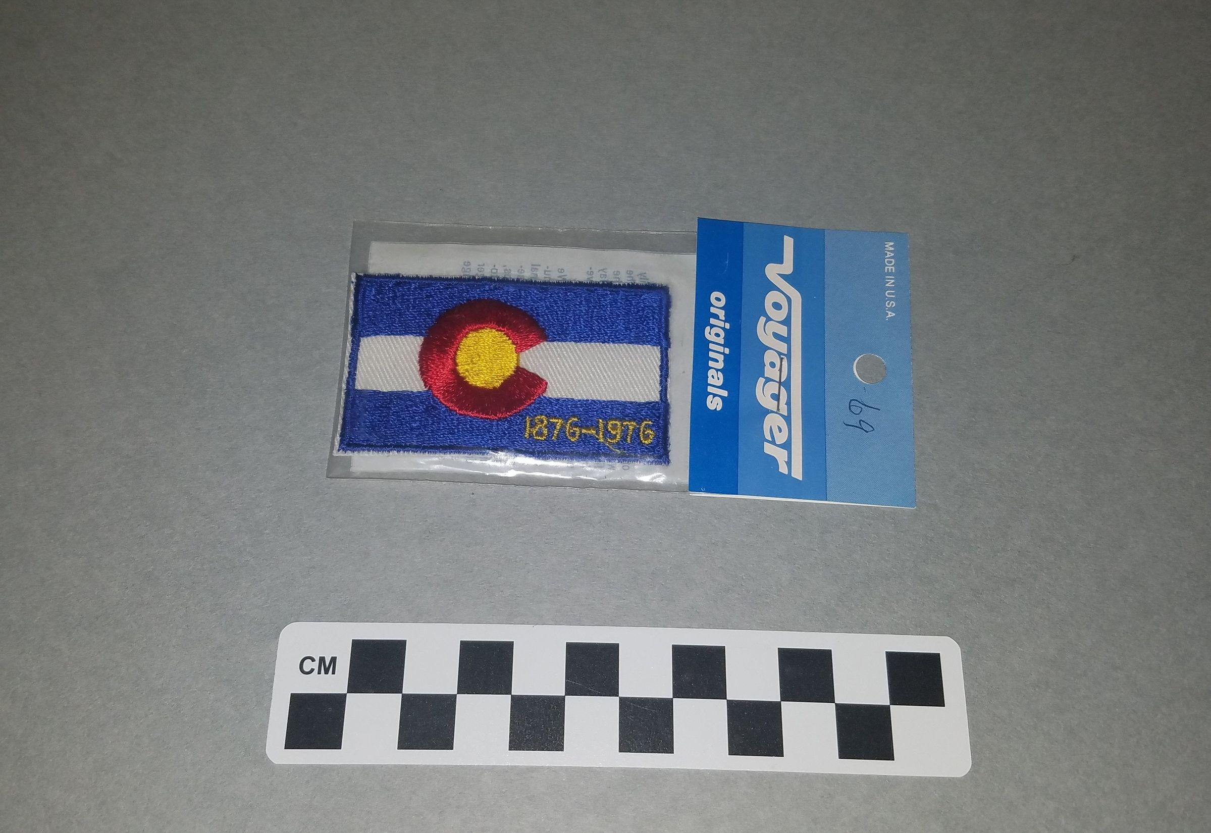 patch, Centennial, with embroidered Colorado flag in a clear plastic bag with blue card board fastener.