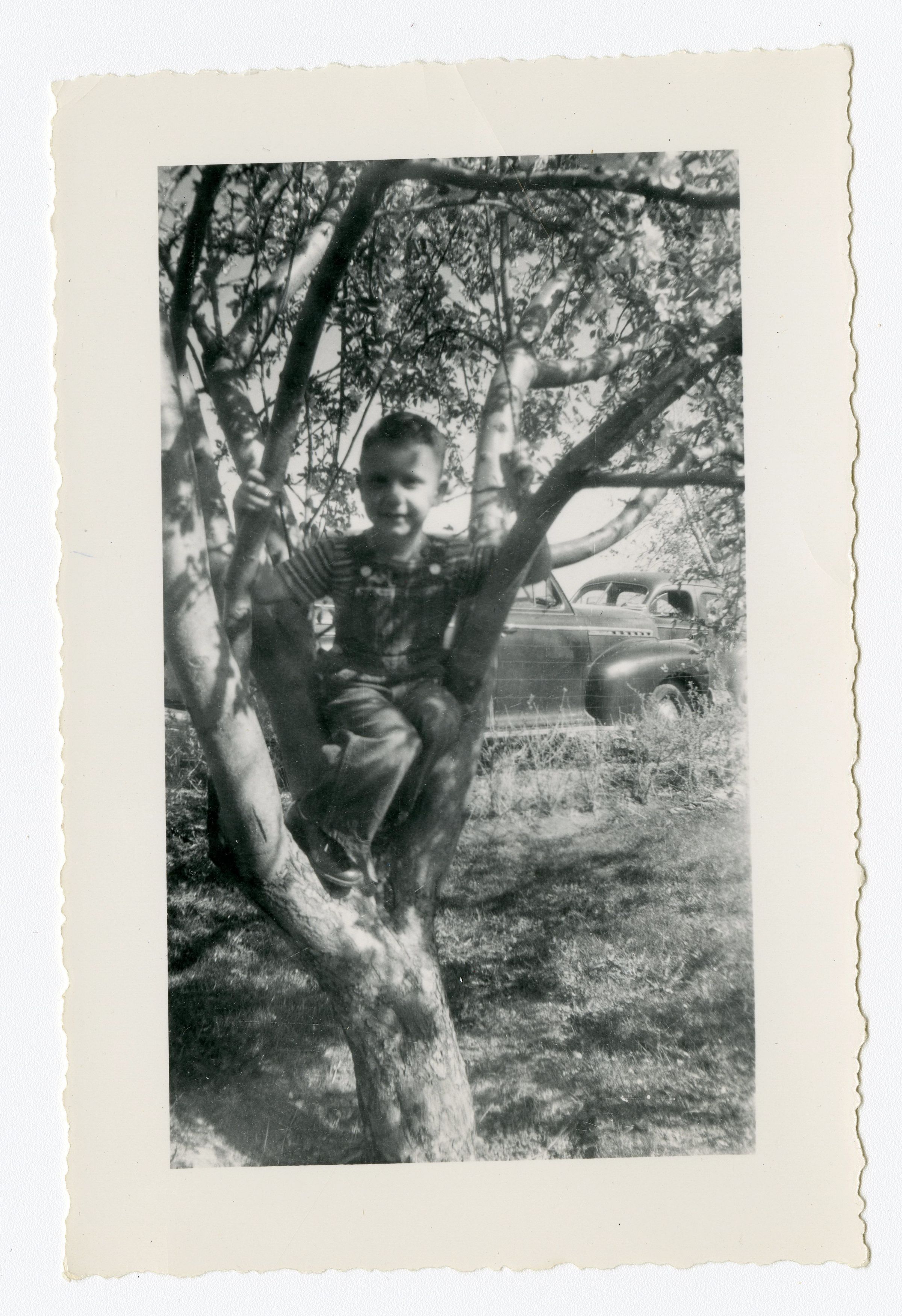 Black and white photograph of a boy in a tree. The boy is wearing a striped shirt and overalls. There are one or two cars in the background. The boy is identified as Lester K Brunner. Photograph was probably taken at the Brunner Farmhouse.