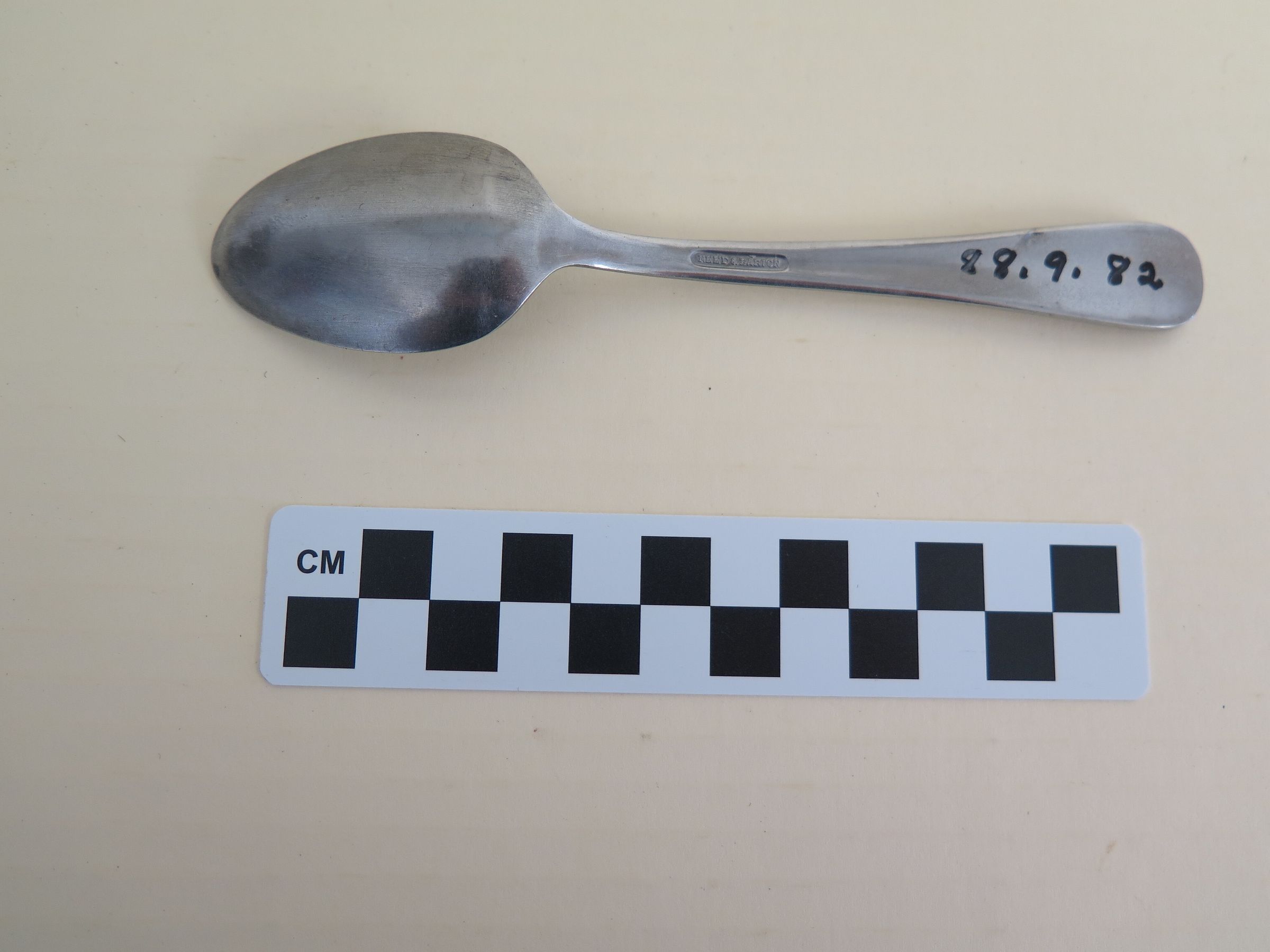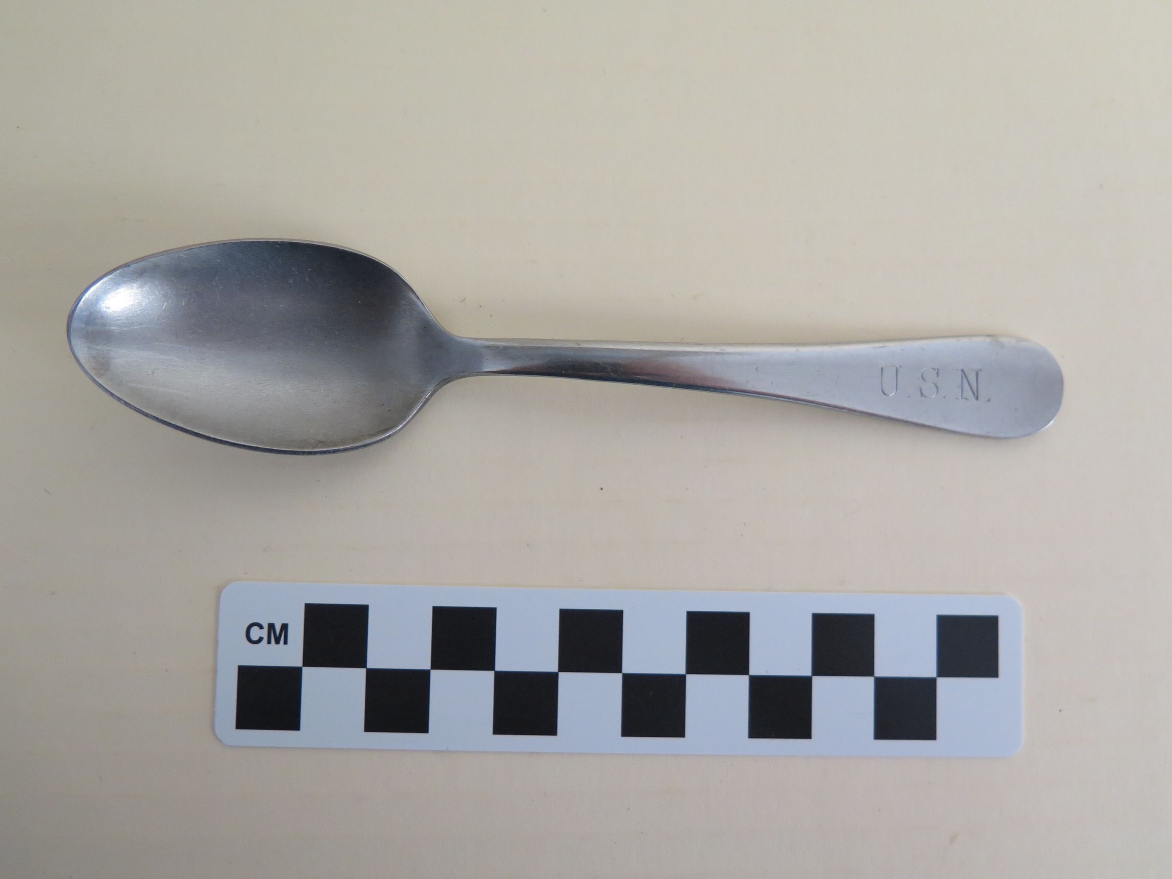 This is a metal US Navy spoon. The front of the handle of the spoon is engraved with the letters "USN". The spoon measures 1.25" (w) x 6" (l).
