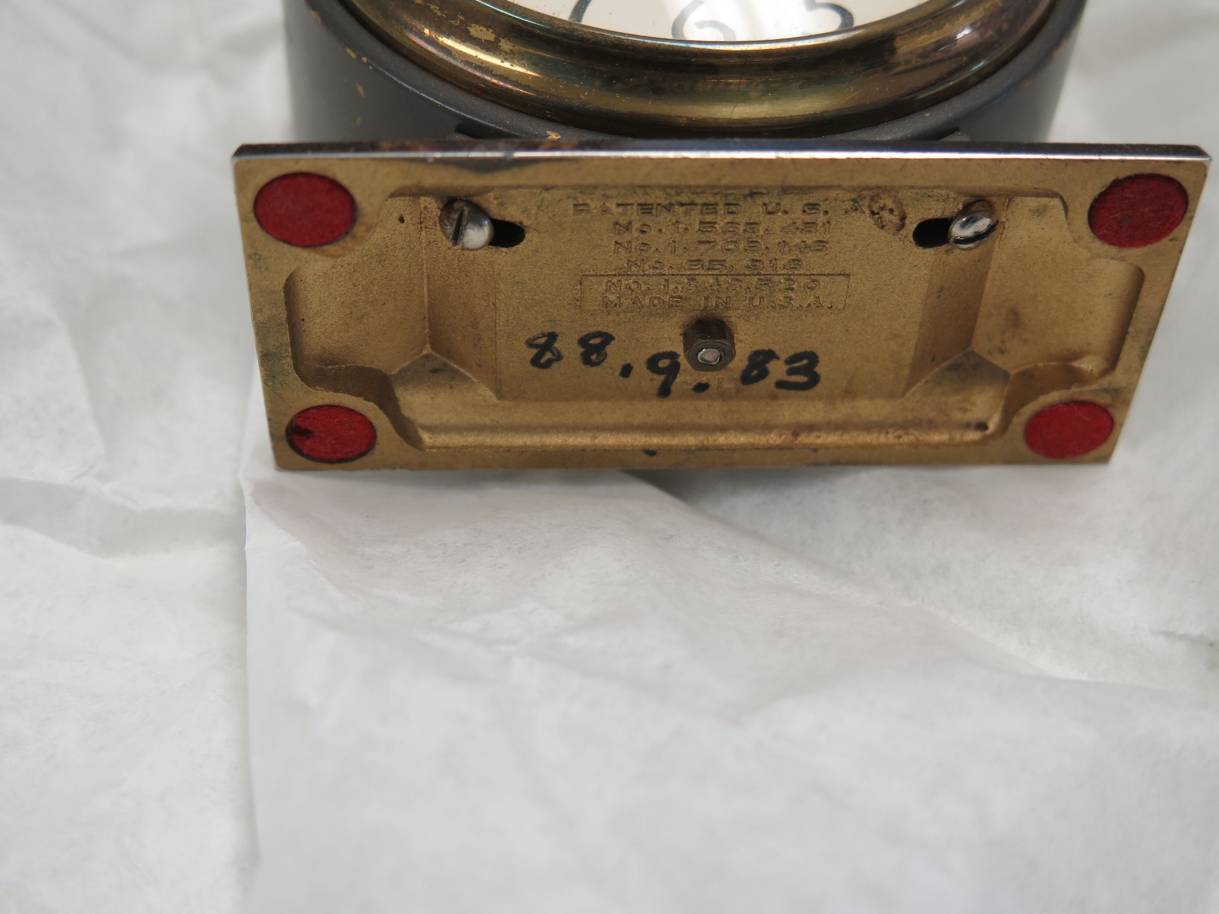This is a brass alarm clock with a 2-1/2" face. The clock measures 3" (h) x 3" (w) x 1.5" (dia).