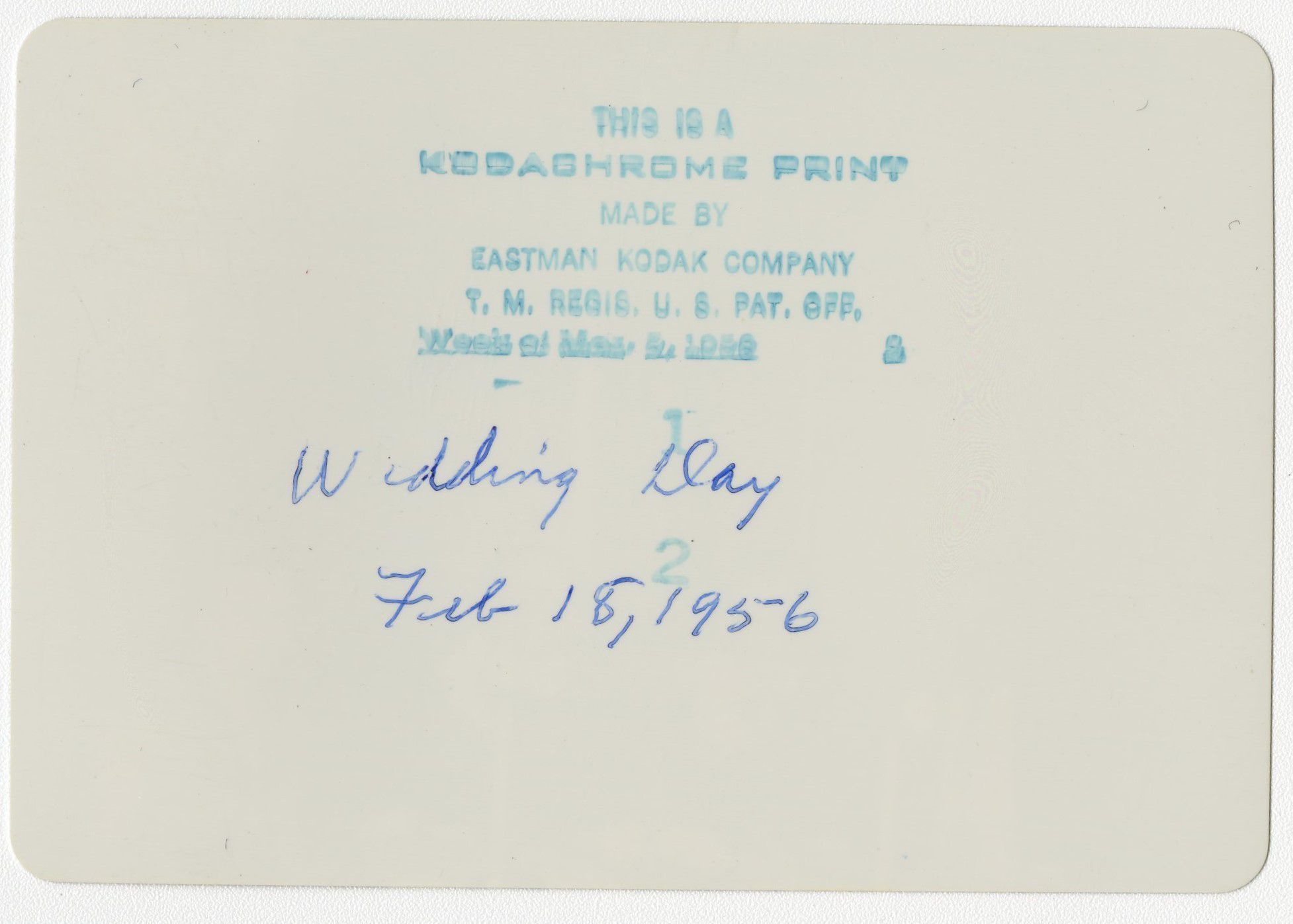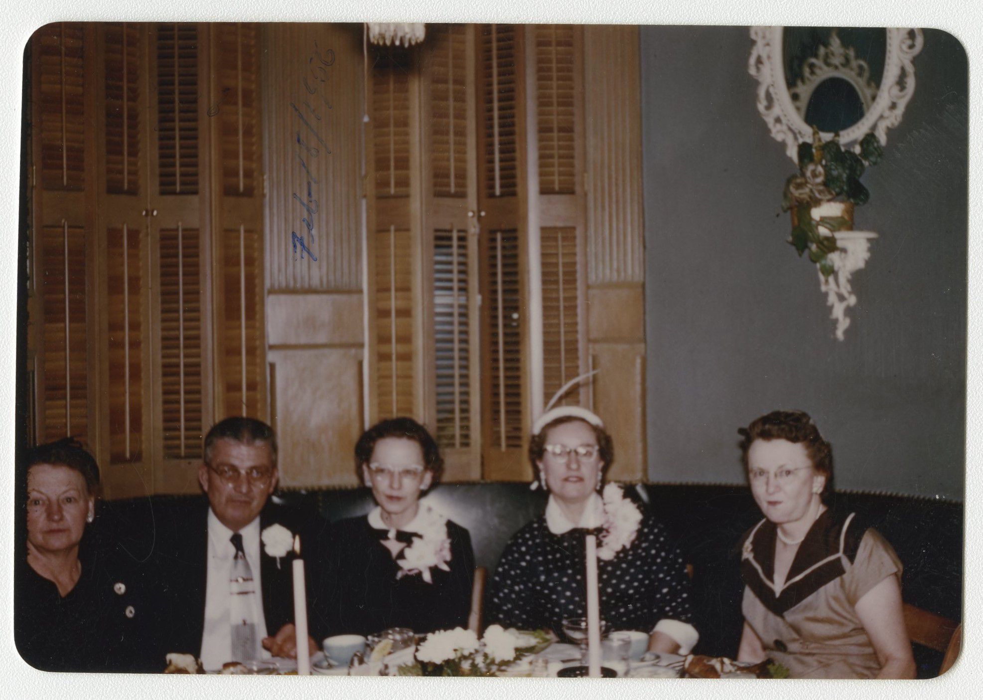 Color photograph of a group of people sitting at a table. Photograph was taken at a wedding that took place on Feb 18, 1956. Photograph is a Kodachrome print. The woman furthest to the left is probably Lib Brunner.