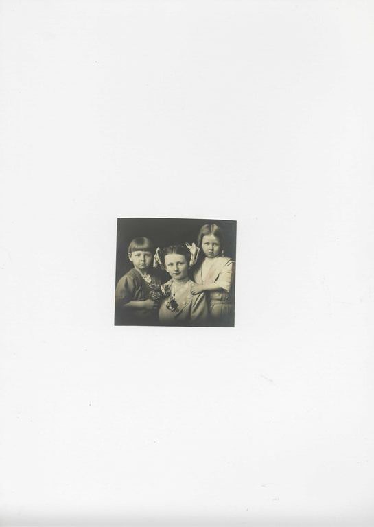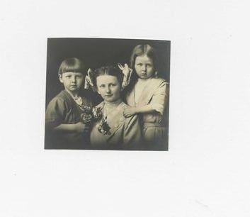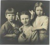 Black and white photograph of three children, one boy and two girls.