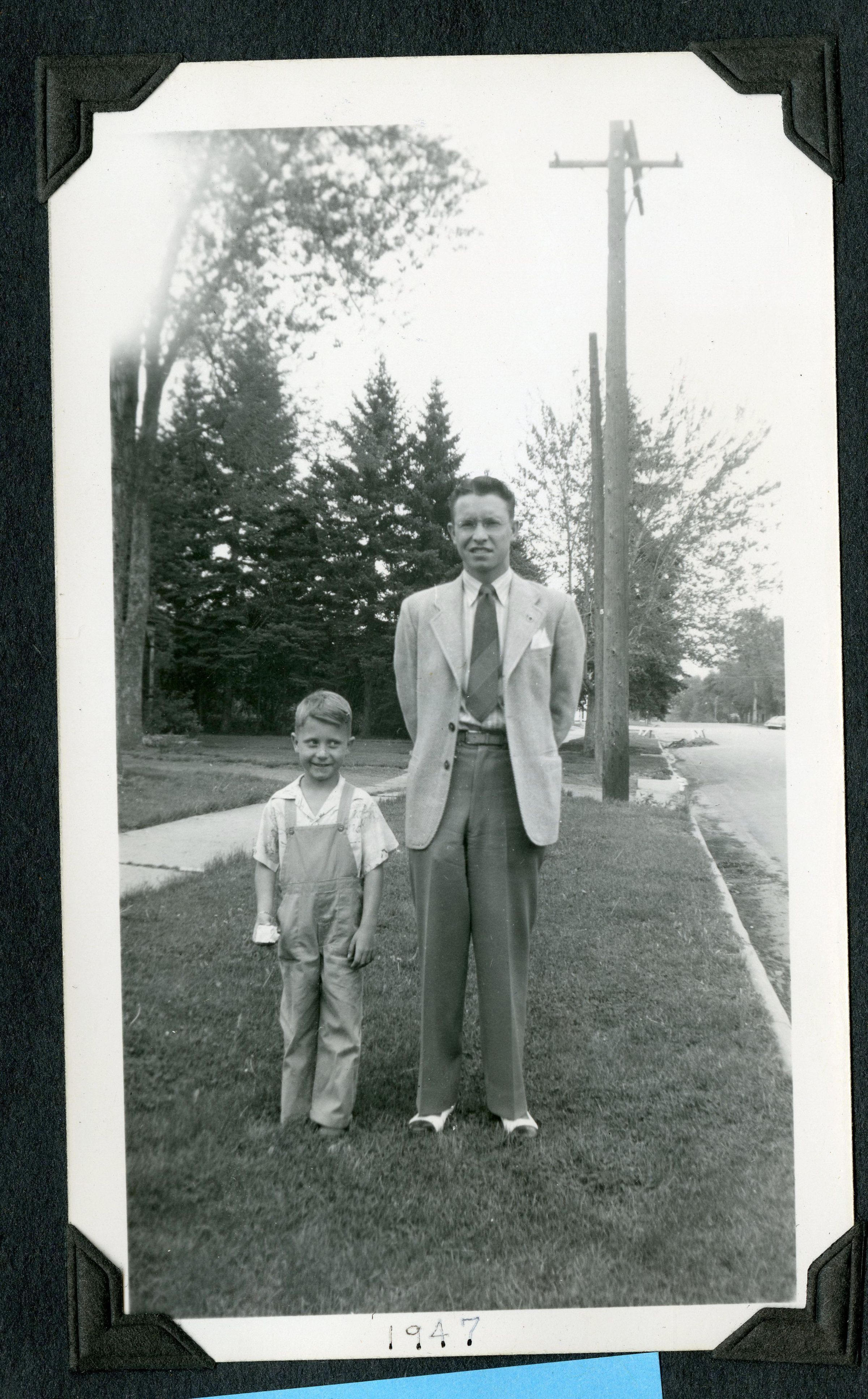 Black and white photograph of two people, one young man and one boy. The boy is Lester K Brunner and the young man is Clyde Brunner.