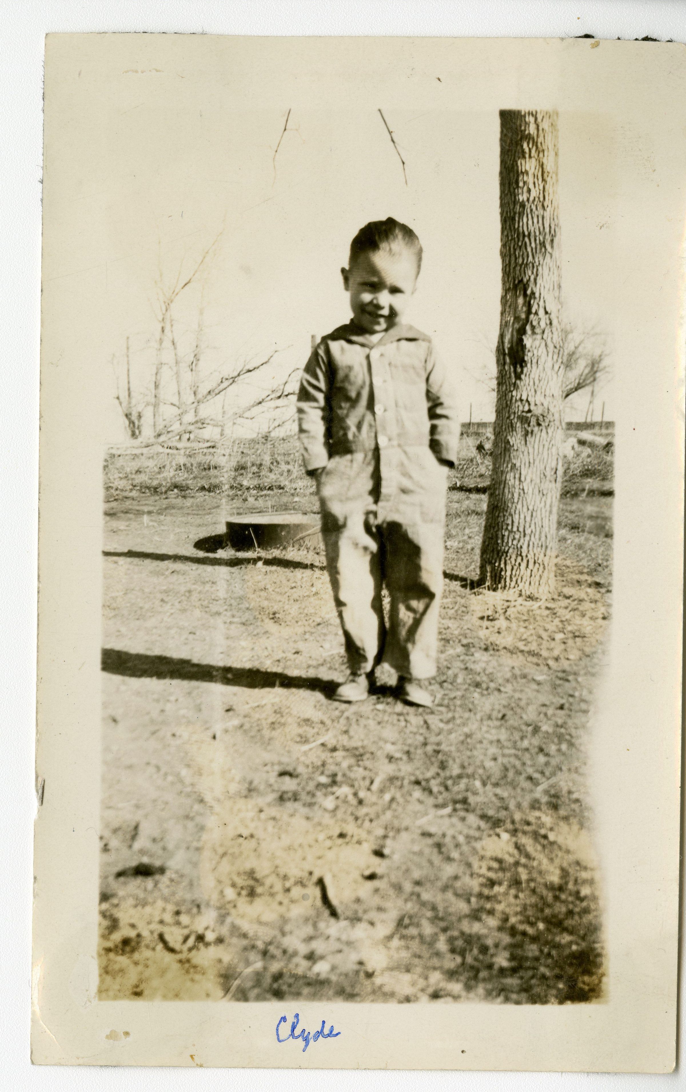 Black and white photograph of Clyde Brunner standing under a tree.