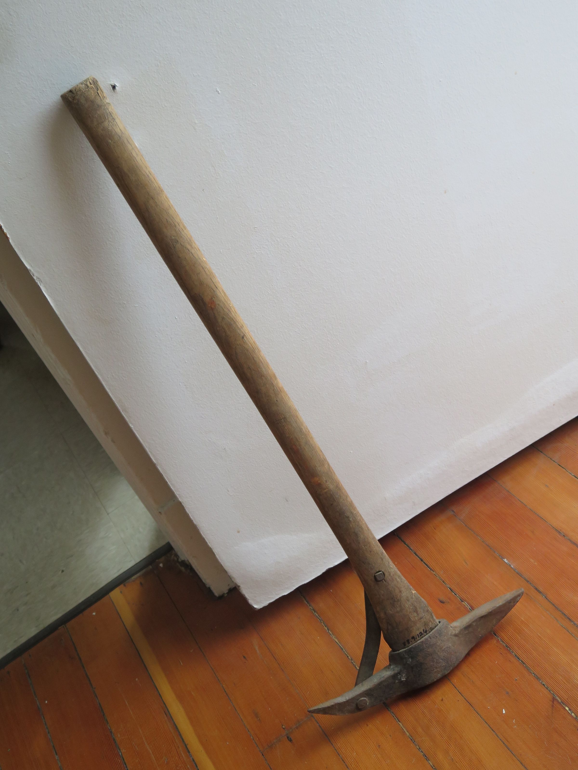 This is a metal pick axe with a wooden handle. The pick measures 32" (h) x 12.5" (w) .Collection
