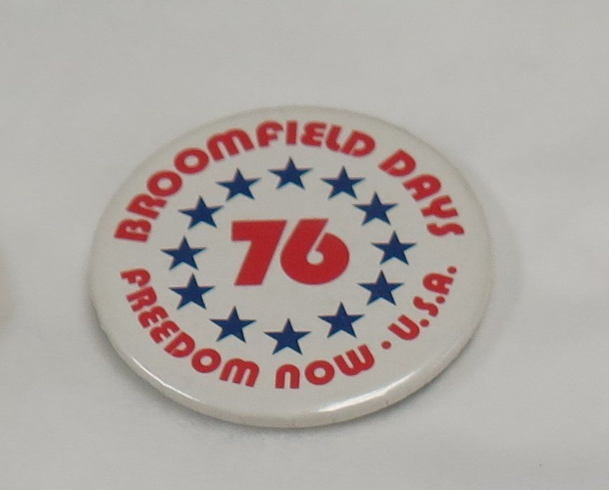 This is a round white Broomfield Days button from 1976. The front of the button has blue stars and red text that reads. "Broomfield Days/ Freedom Now U.S.A/ 76". The button measures 2.25" (dia).Collection