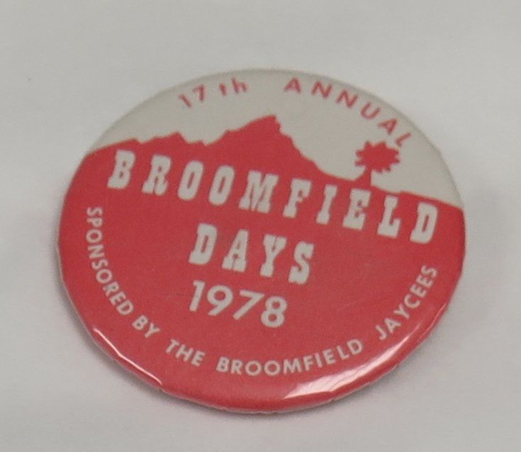 This is a button from Broomfield Days in 1978. The button has red and white text that reads, "17th Annual/ Broomdield/ Days/ 1978/ Sponsored by the Broomfield Jaycees". The button measures 2.25" (dia).Collection