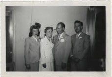 Black and white photograph of two men and two women standing inside of a building. The man and the woman in the center of the image are Gib and Ila Brunner. All four people are dressed up for a nice occasion.