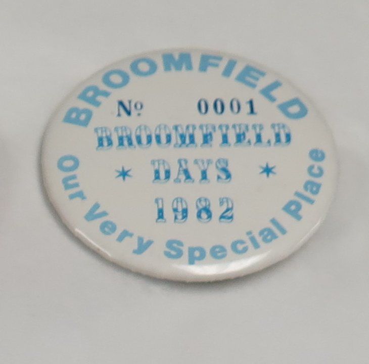 This is a round white button from Broomfield Days in 1982. The button has blue text on the front that reads, "Broomfield/ No. 0001/ Broomfield/ Days/ 1982/ Our Very Special Place". The button measures 2.25" (dia).Collection