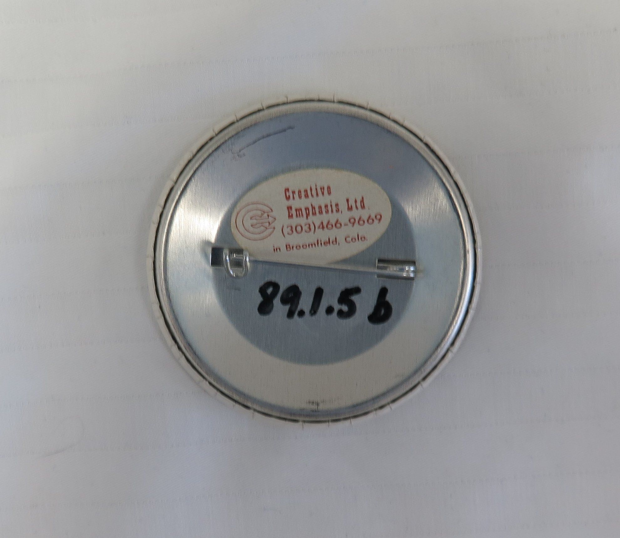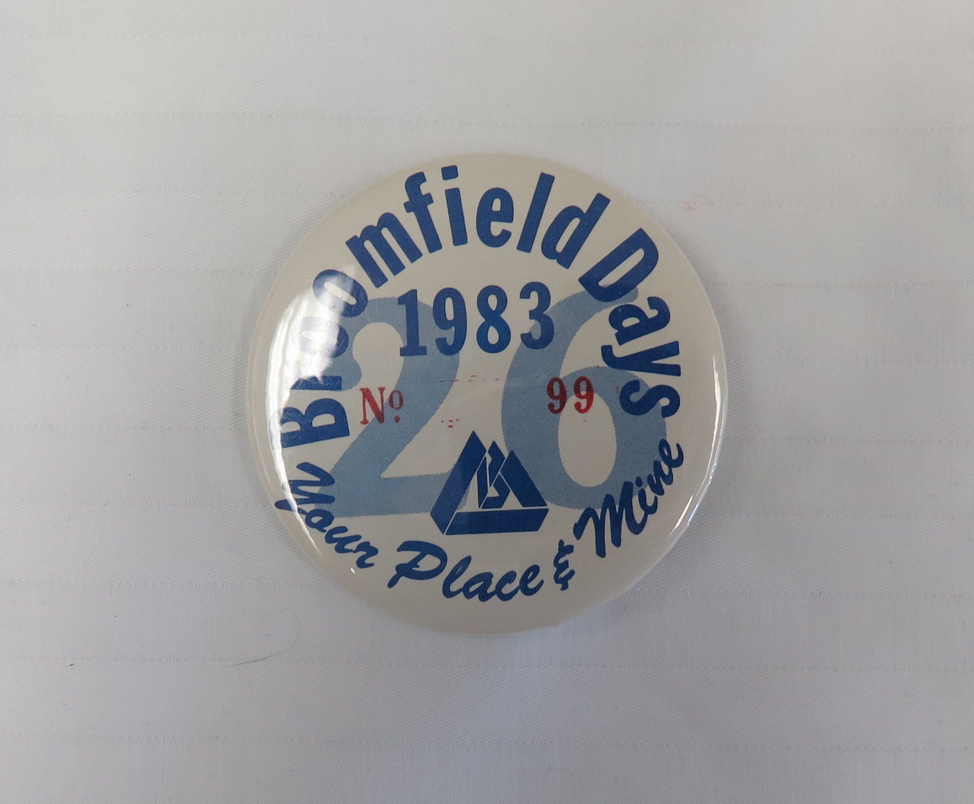 This is a button with a pin closure on the back. The text on the front of the button reads,"Broomfield Days/ 1983/ Your Place & Mine". The button was made by Creative Emphasis, Ltd. The button measures 2.25" (dia).Collection