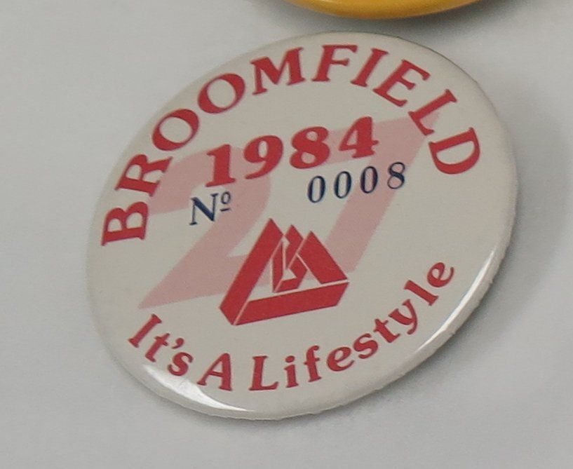This is a round white button from Broomfield Days in 1984. The button has red text on the front that reads, "Broomfield/ 1984/ No 0008/ It's A Lifestyle". The button measures 2.25" (dia).Collection