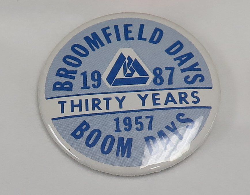 This is a round blue and white button from Broomfield Days in 1987. The button has blue text on the front that reads, "Broomfield Days/ 1987/ Thirty Years/ 1957/ Boom Days". The button measures 2.25" (dia).Collection