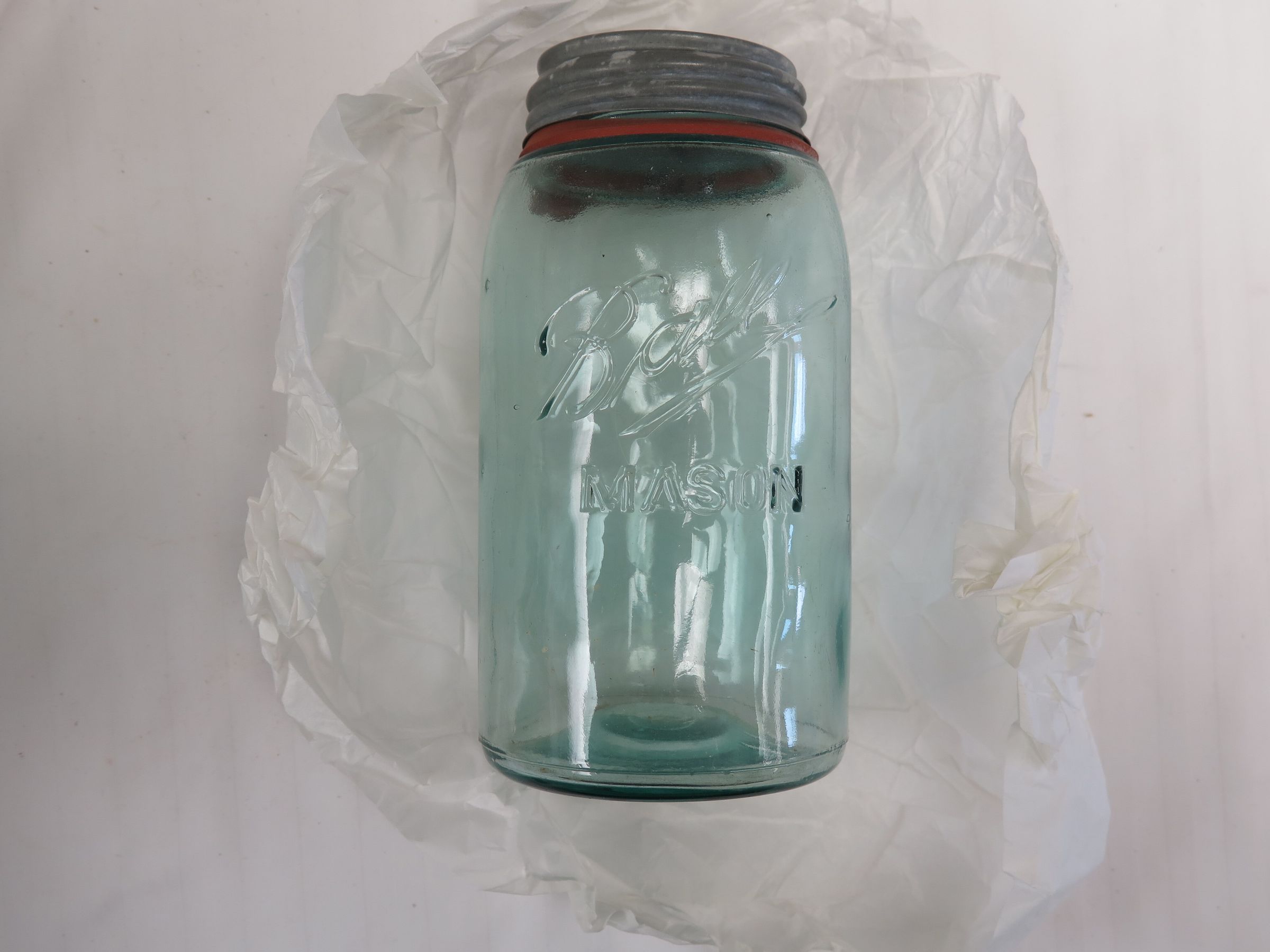 This is a blue glass Ball brand Mason jar with a metal (likely zinc) lid with milk-glass interior, and a red rubber sealer. The jar measures 7" (h) x 3.25" (dia).
