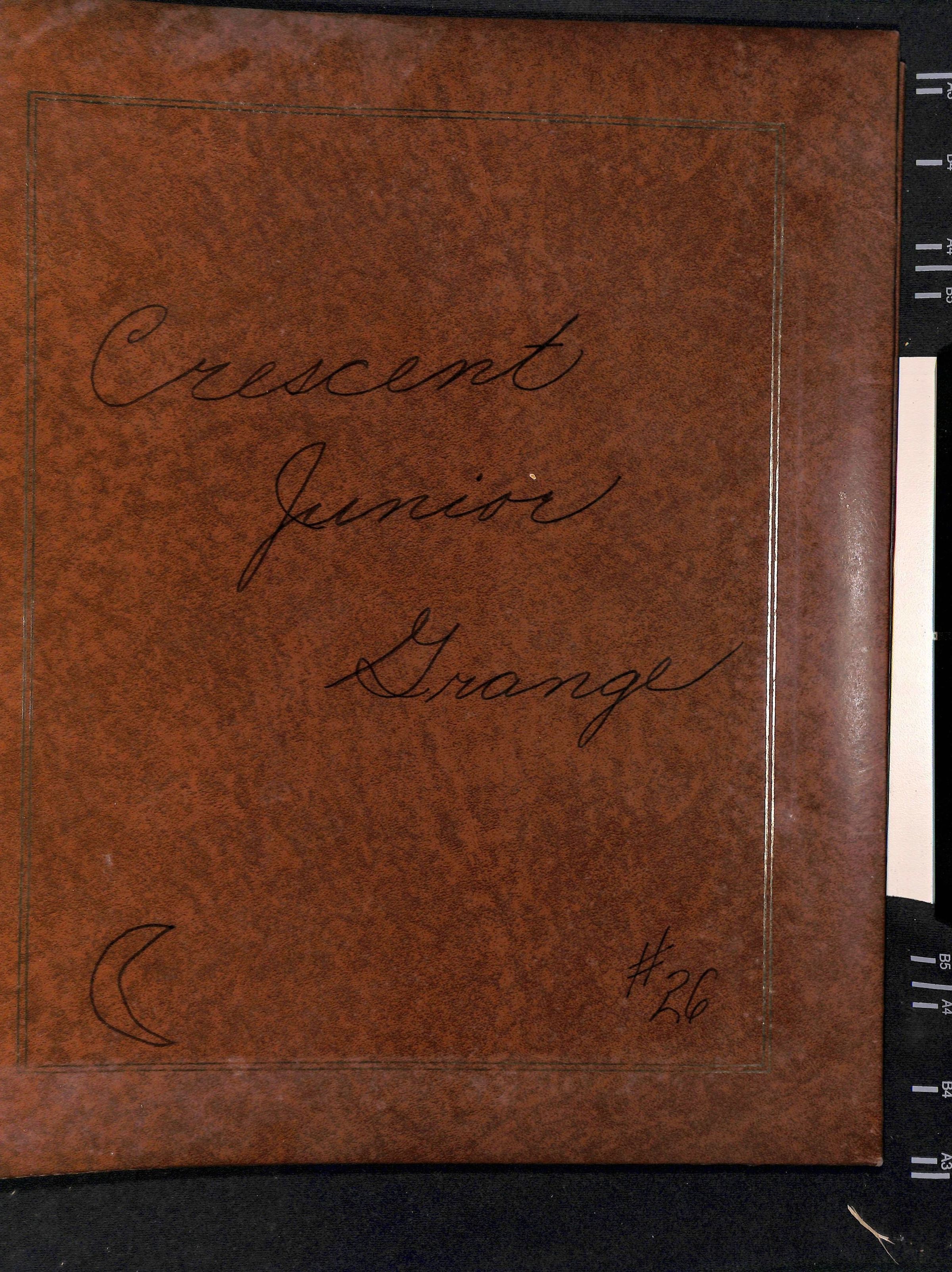 Item is a large hard-cover scrapbook from the Crescent Grange, an organization that served as a means of social gathering for early Broomfield residents. The cover is dark brown with gold accents, with the words "Crescent Junior Grange / #26" written on the front in black ink. Rather than being a traditional scrapbook of personal memories, this one contains information about the history of Broomfield written (mostly by hand) by Junior Grangers, members of a youth group run by the Crescent Grange. These entries include photographs, hand-drawn maps, and articles about the focal points of Broomfield's culture: its history as an agricultural center, its founding residents, and the institutions that grew the area. Important places are highlighted as well: the Methodist Church, the public library, schools, the bank, and the telephone office.Collection