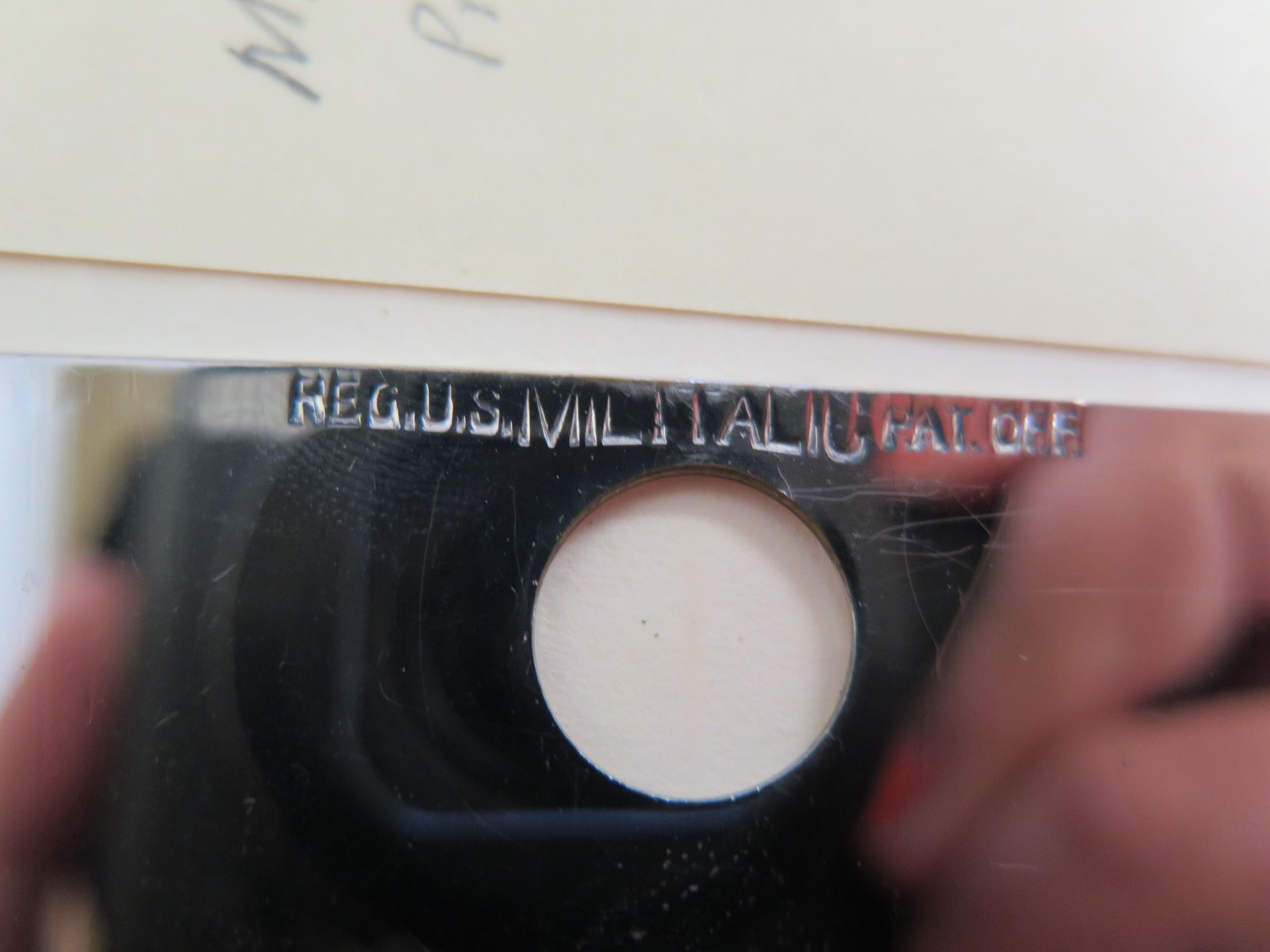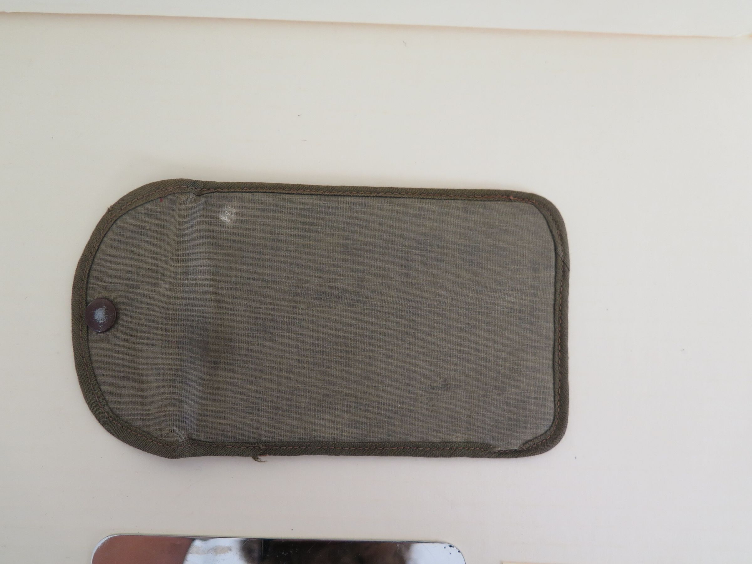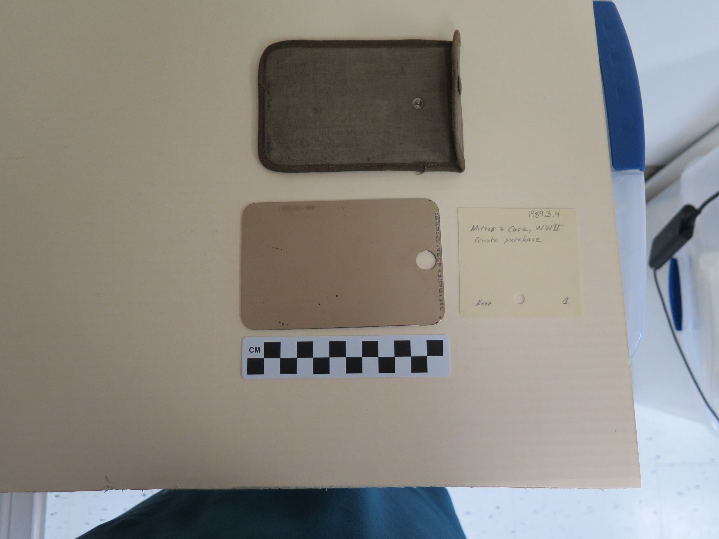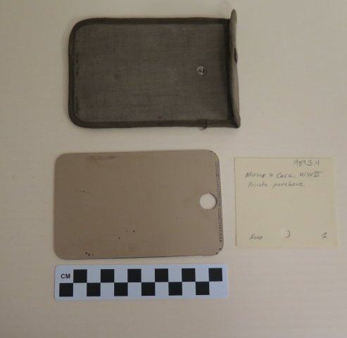 This is a military shaving mirror in a case. The case is olive green and has a button closure. On one side of the mirror is engraved: "REG.US MILITALIC PAT. OFF". On the other is engraved: "DEFIANCE CHECK WRITING CORP. ROCHESTER, N.Y. USA". The case measures 3.75" (w) x 5.25" (l).
