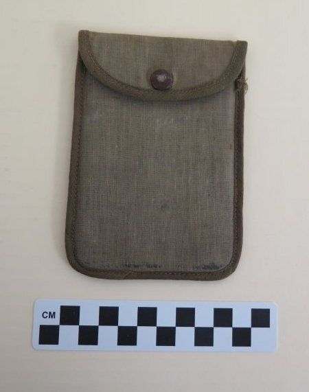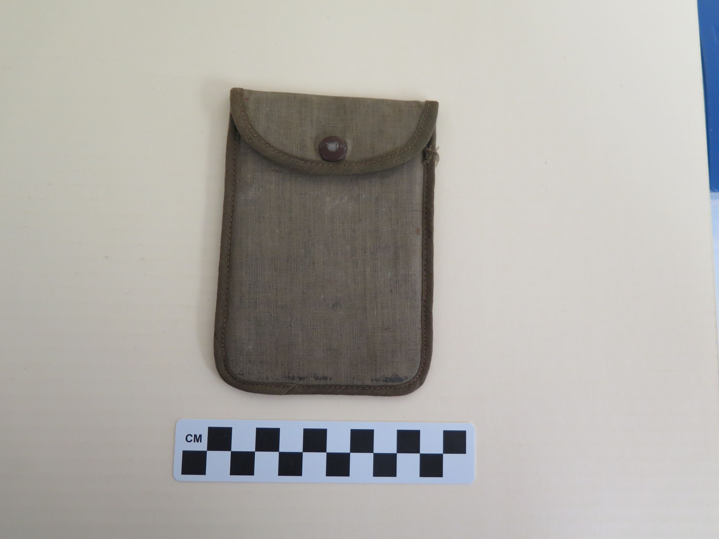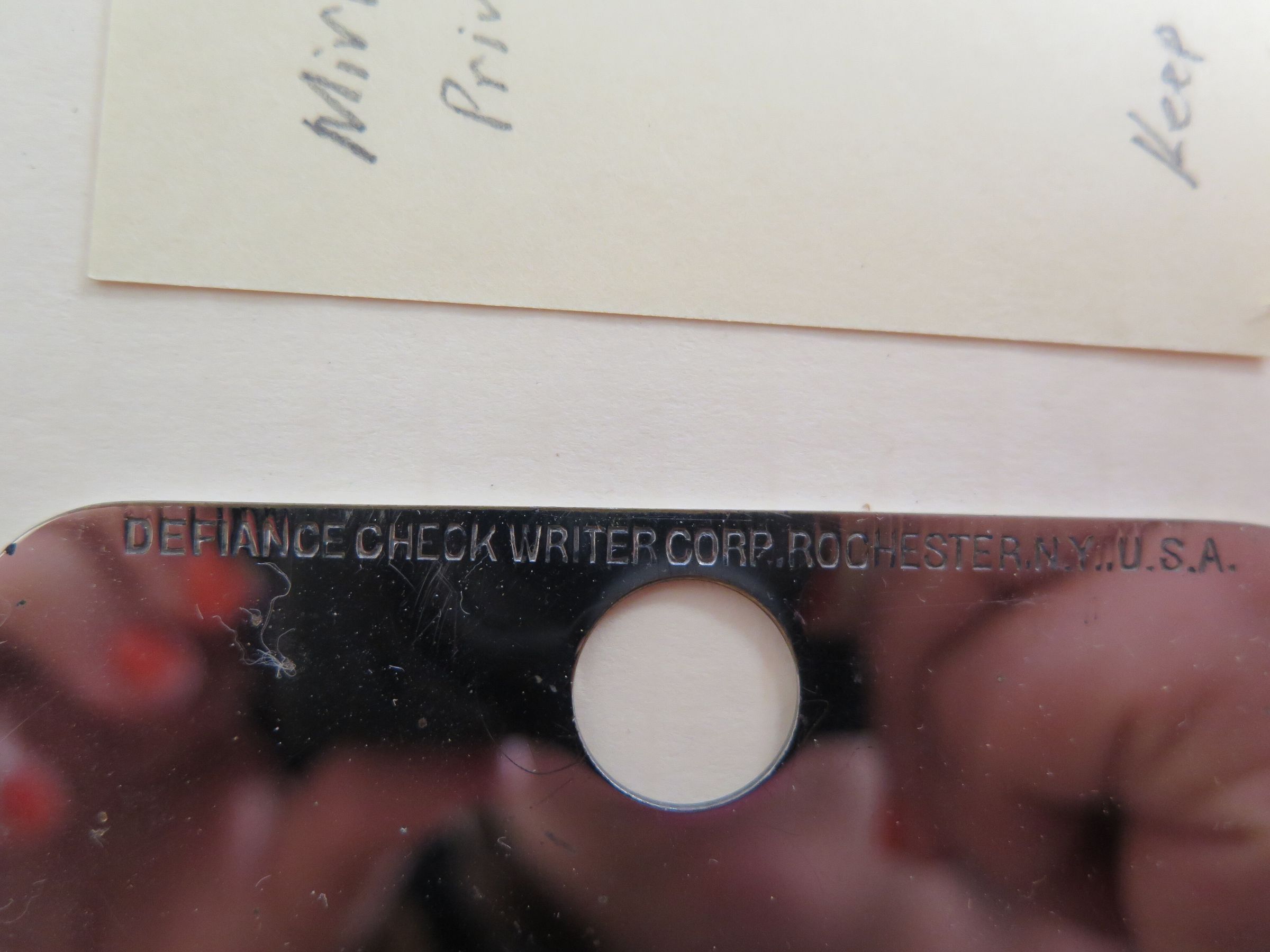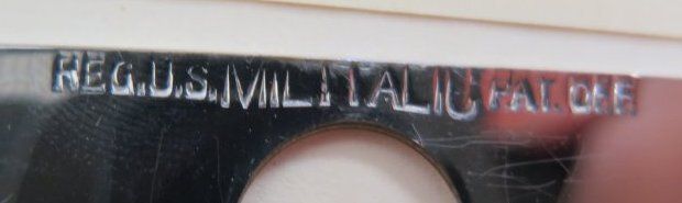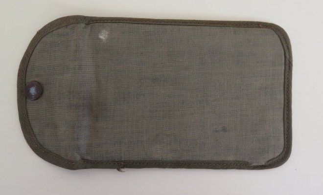 This is a military shaving mirror in a case. The case is olive green and has a button closure. On one side of the mirror is engraved: "REG.US MILITALIC PAT. OFF". On the other is engraved: "DEFIANCE CHECK WRITING CORP. ROCHESTER, N.Y. USA". The case measures 3.75" (w) x 5.25" (l).