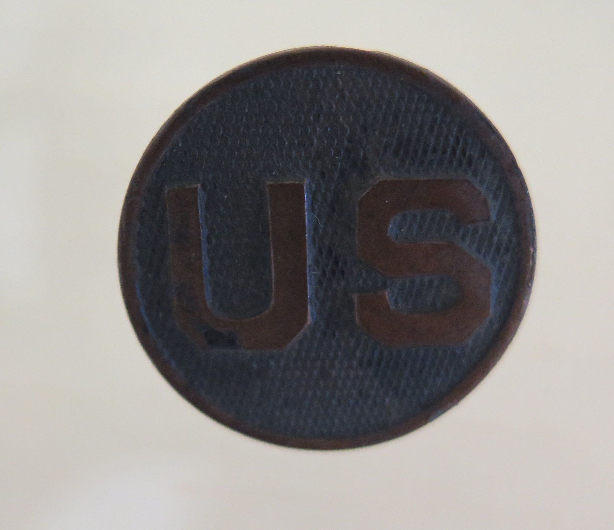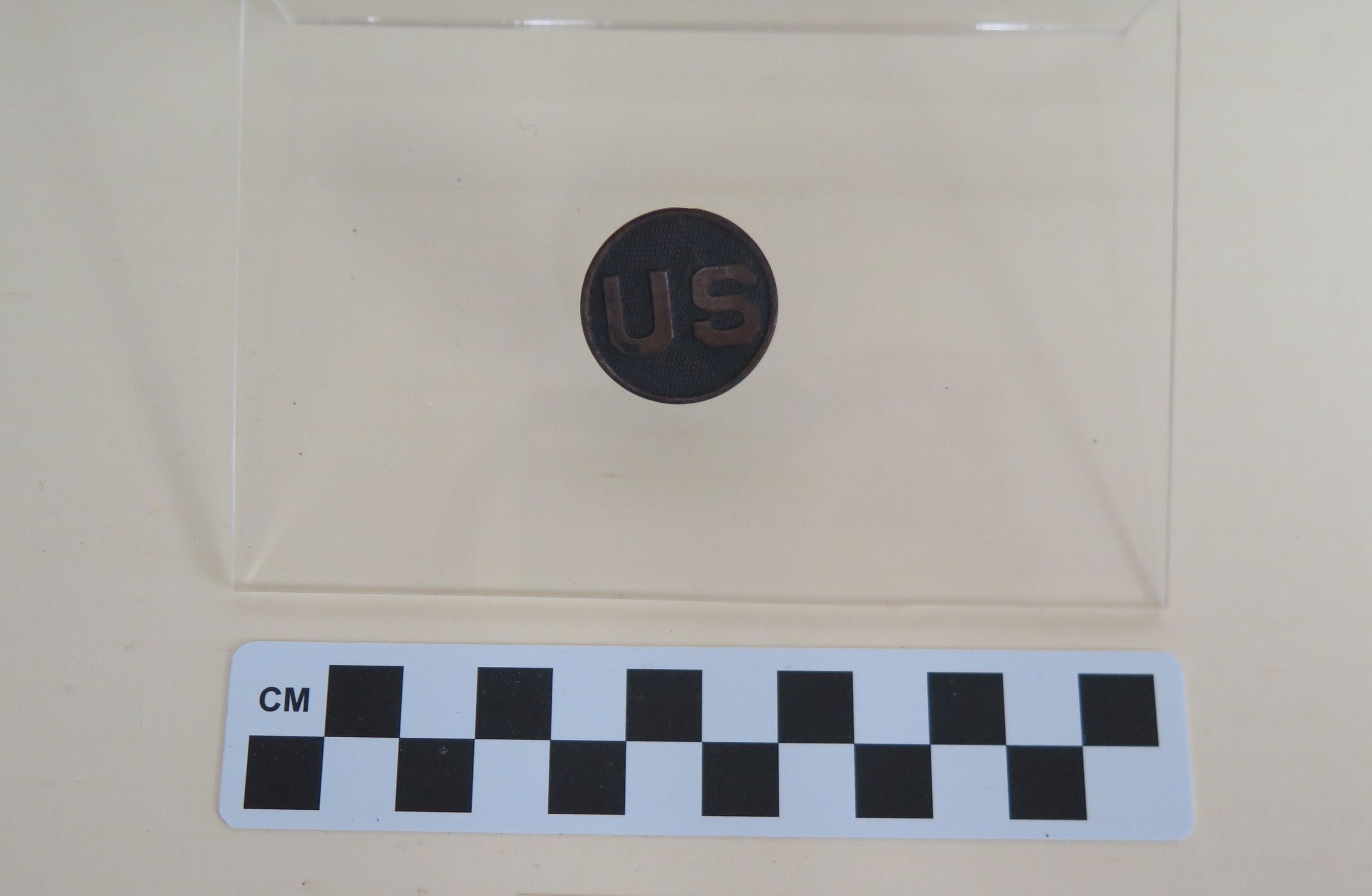 This is a World War I (WWI) U.S. Army Enlisted collar disk. The pin is metal with the letters "US" in the center. The disk measures 1" (dia).