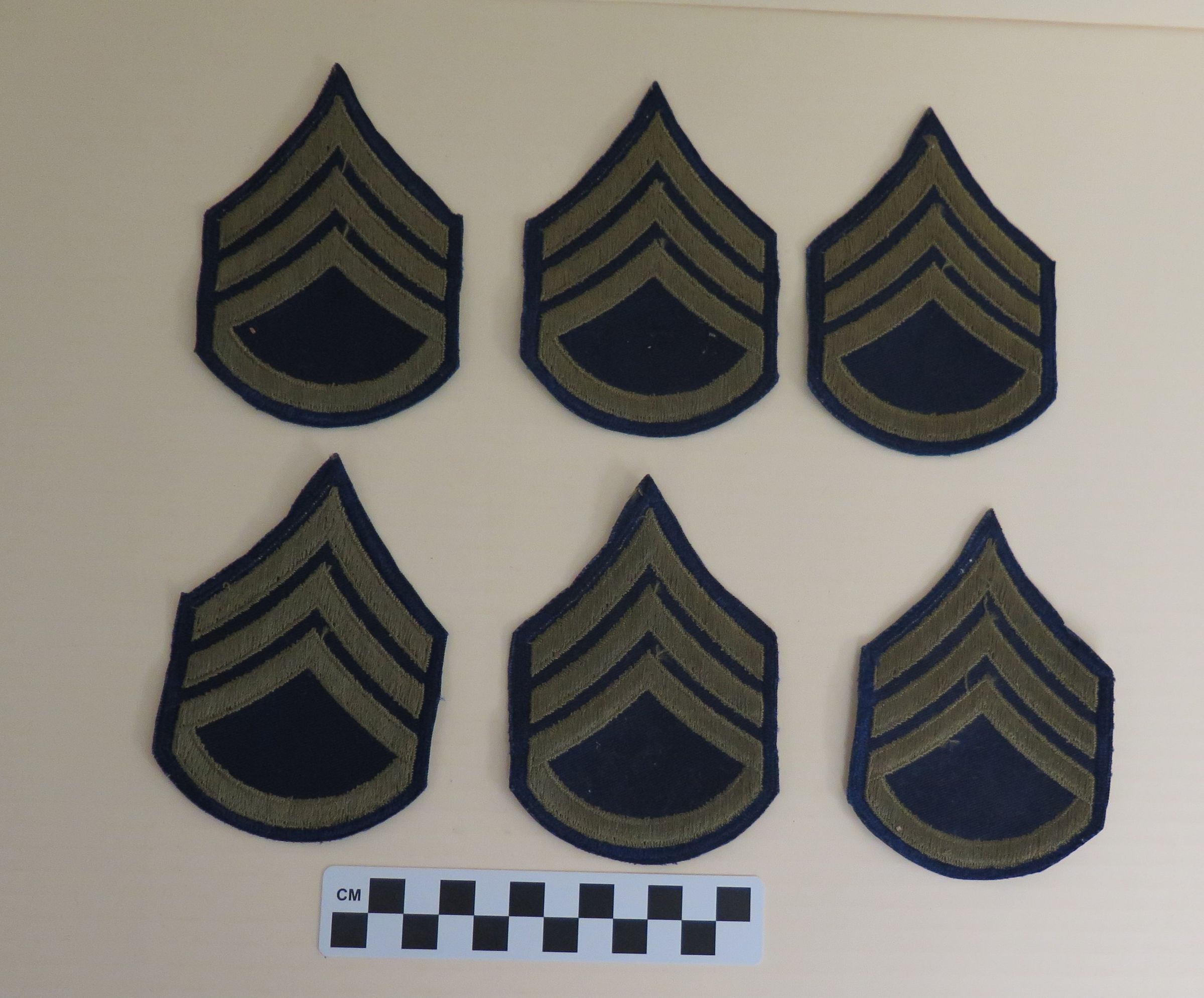 This is a set of 6 military rank insignia patches from World War II (WWII) . The patches are black with 3 gold colored V-shaped stripes on them. Each patch measures 3" (w) x 4.75" (l).