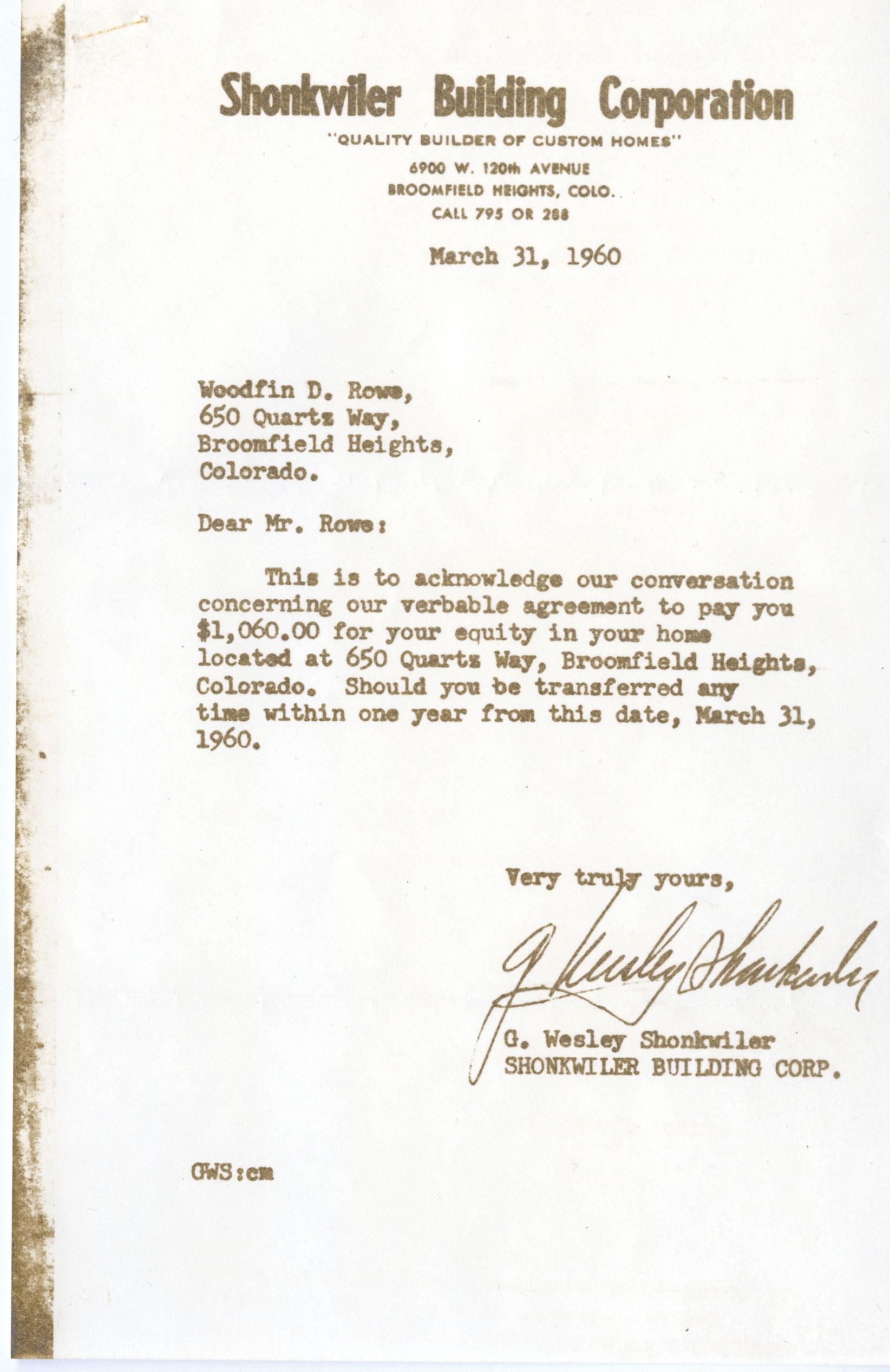 Item is a printed letter from G. Wesley Shonkwiler of the Shonkwiler Building Corporation to Woodfin D. Rowe of 650 Quartz Way, Broomfield Heights, Colorado.