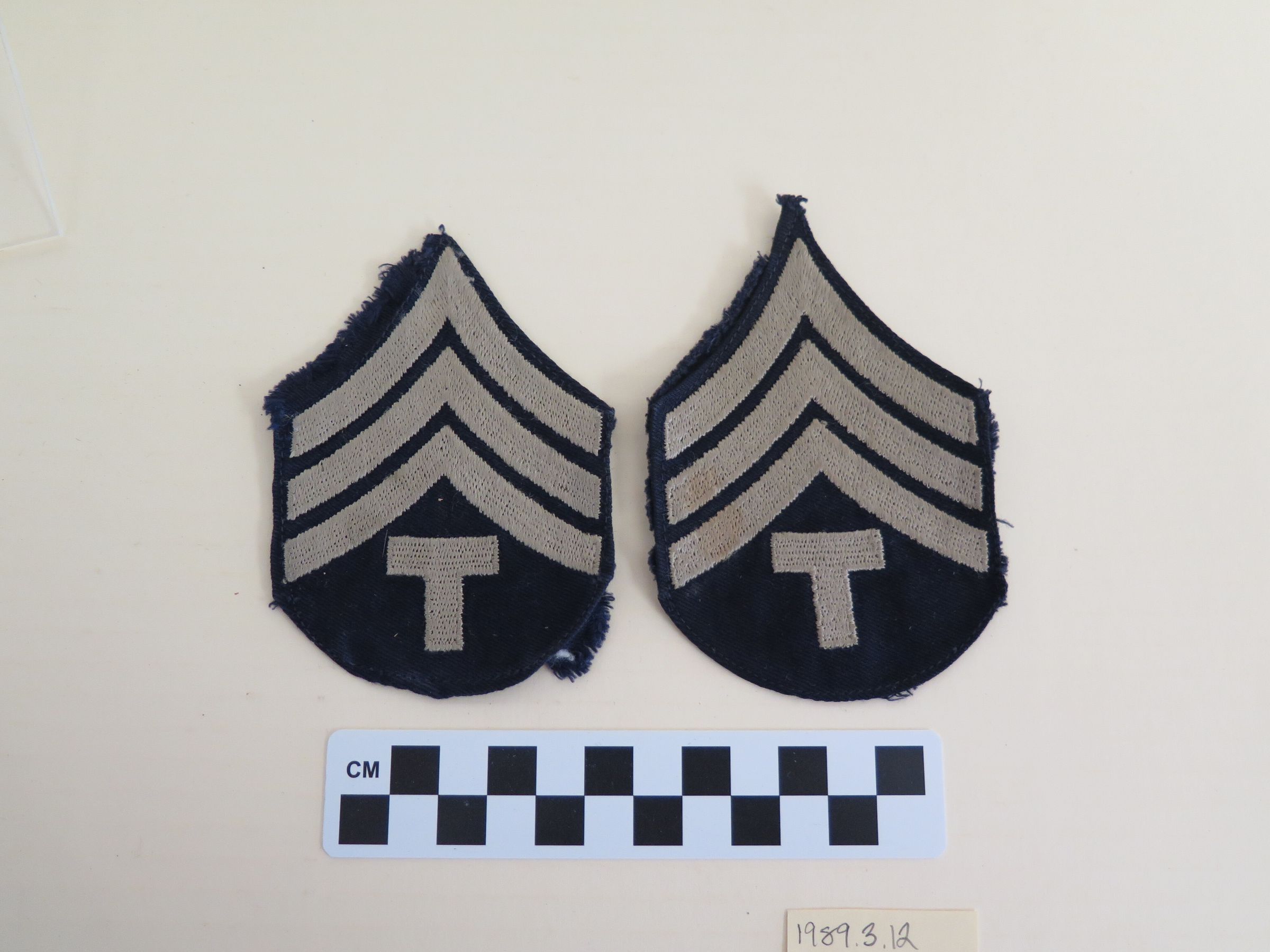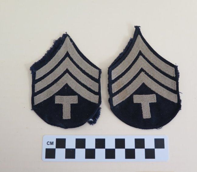 This is a set of two black and gold U.S. Army insignia patches. The patches have 3 gold stripes and the letter T on them. The patches each measure 3" (w) x 4" (l).