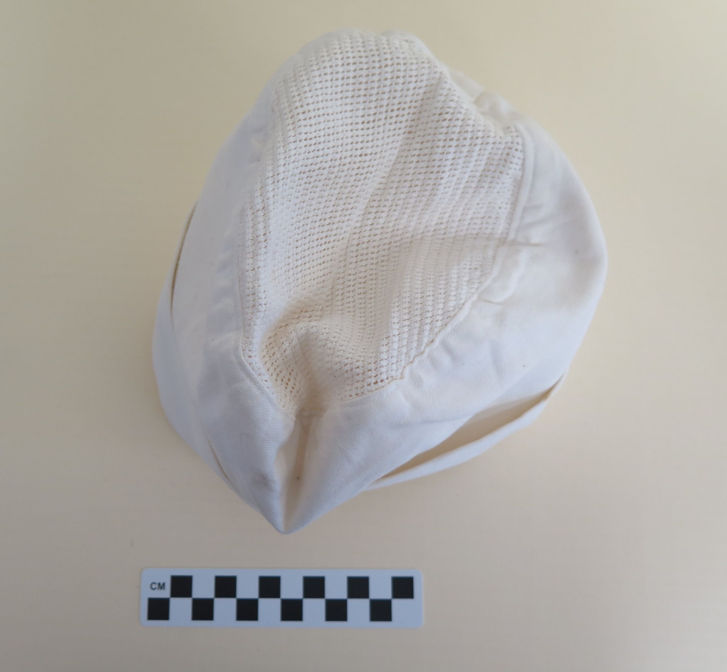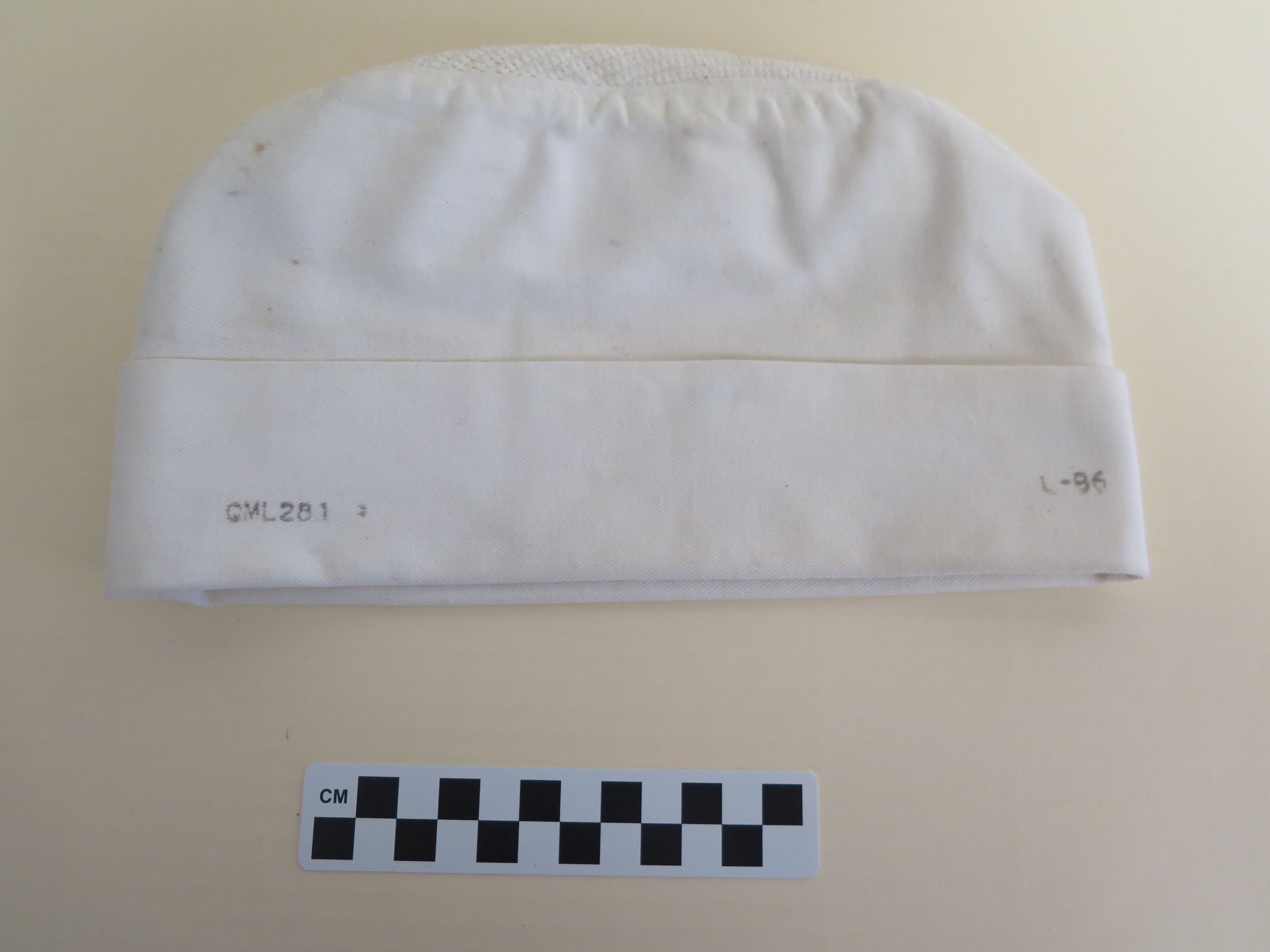 This is a white cotton military cook's hat. The side of the hat is stamped with "GML 281" and "L-86". The top of the hat is made of a mesh-like material. The hat measures 6" (h) x 6" (w) x 7" (l).