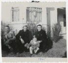 Black and white photograph of three men and a boy sitting near a house. A bay window is seen behind the people. Handwritten in blue ink on the lower edge of the photograph is "1945." The two men on the right are wearing naval uniforms. The people are Gib Brunner, Clyde Brunner, Dale Brunner, and Lester K Brunner. All four people are wearing coats.