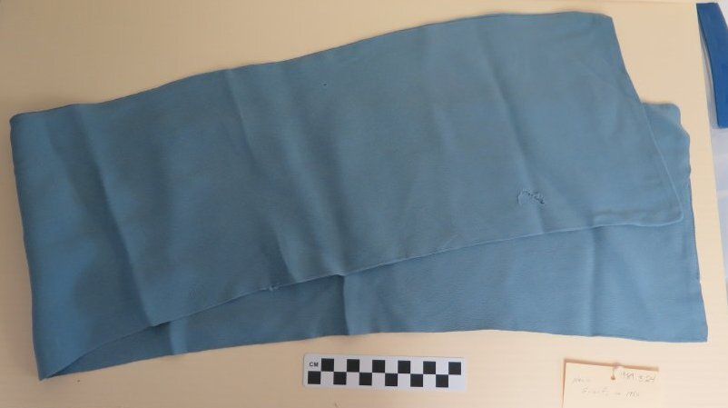 This is a light blue military neck scarf. The scarf measures 7" (w) x 43" (l).