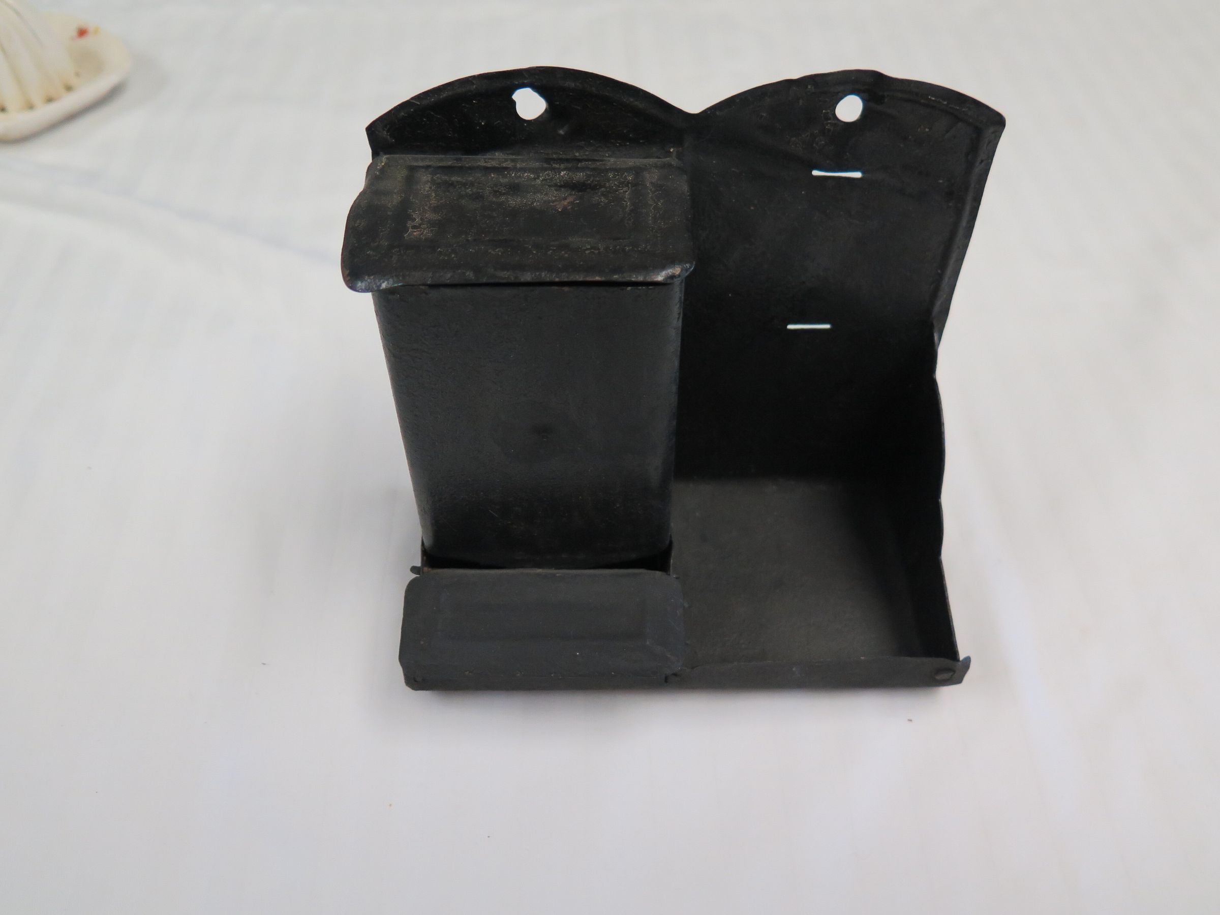 This is a black metal match holder and dispenser. The holder has 2 holes at the top where it can be attached to a wall. The holder measures 6" (h) x 6.25" (w) x 3" (d).