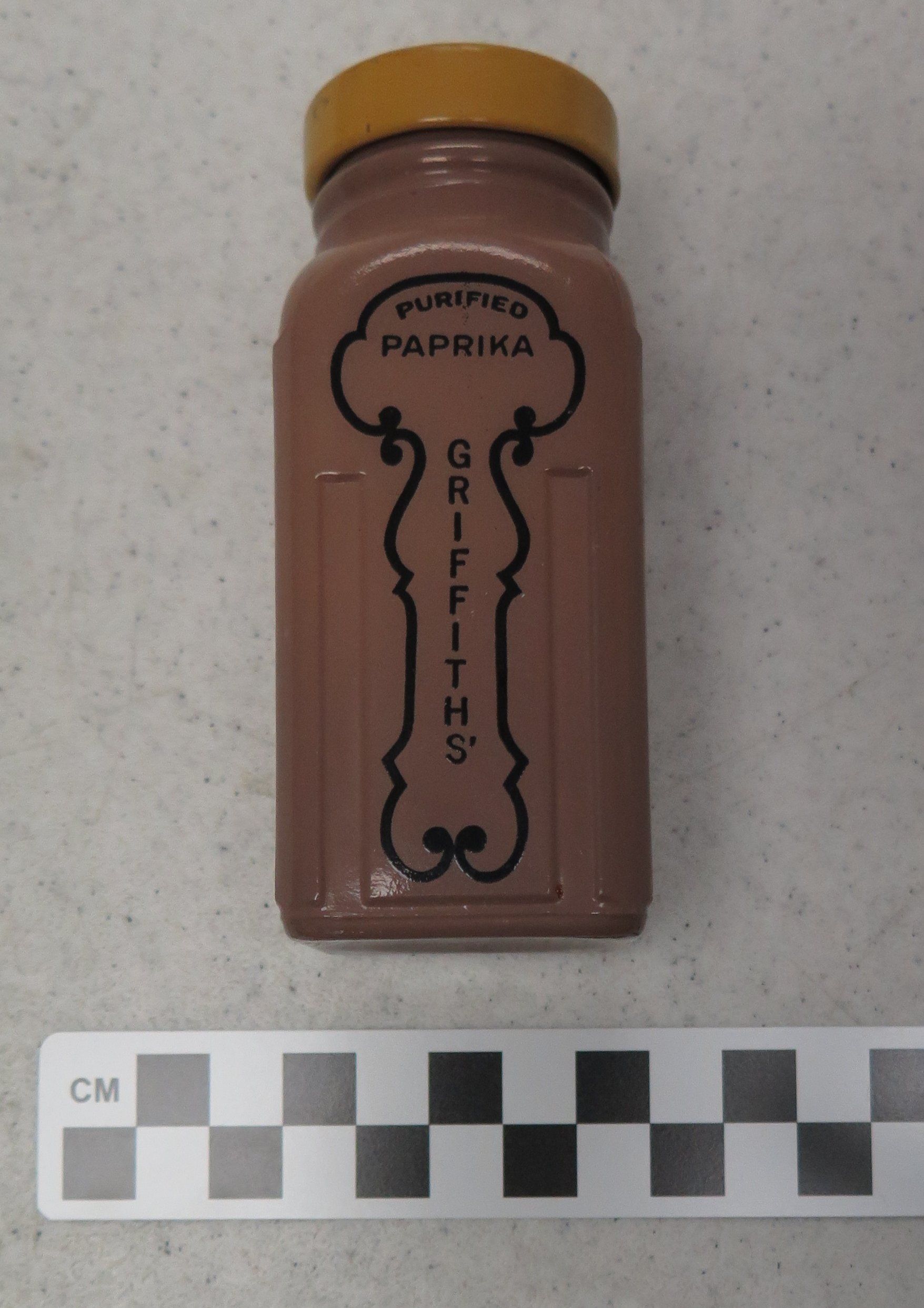 This is a brown glass spice bottle measuring 4"(H) x 1.75"(W) x 1.75"(D) labeled "Griffith's Purified Paprika".