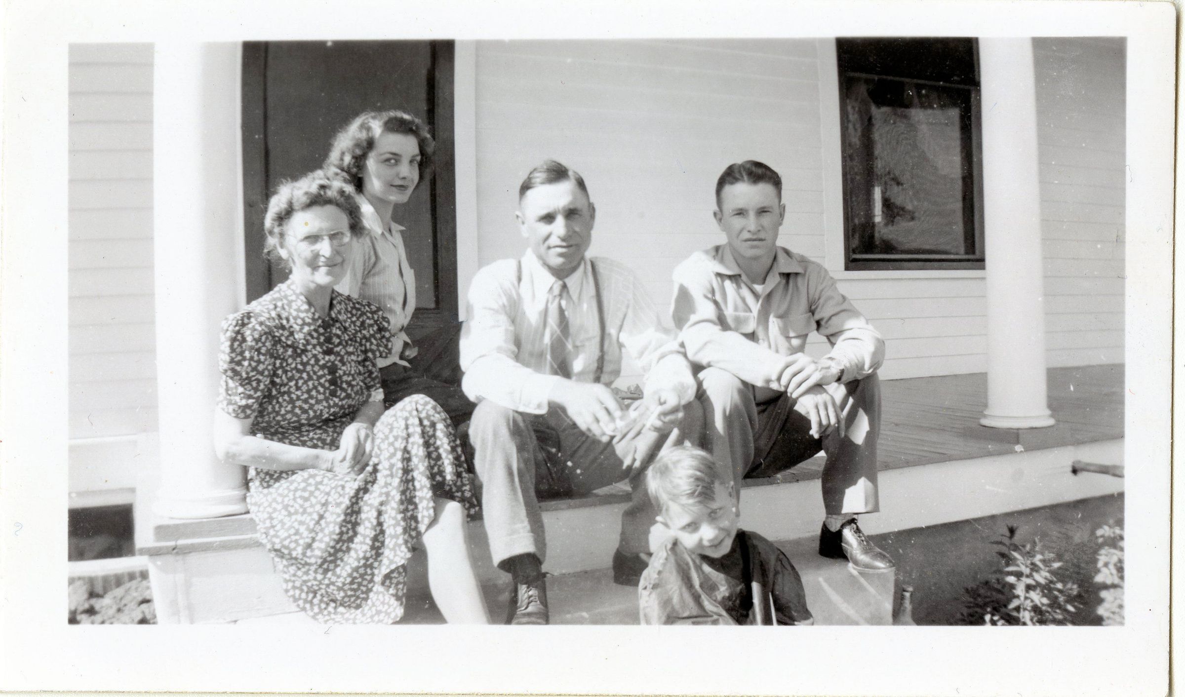 Black and white photo of four adults and one child sit on the porch of the Brunner Farmhouse. Pictured left to right is unknown, Gloria ?, Lester C. Brunner, Clyde Brunner, and Lester K. Brunner.