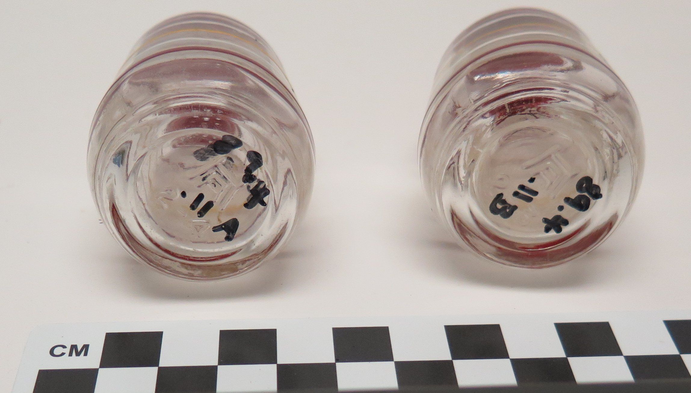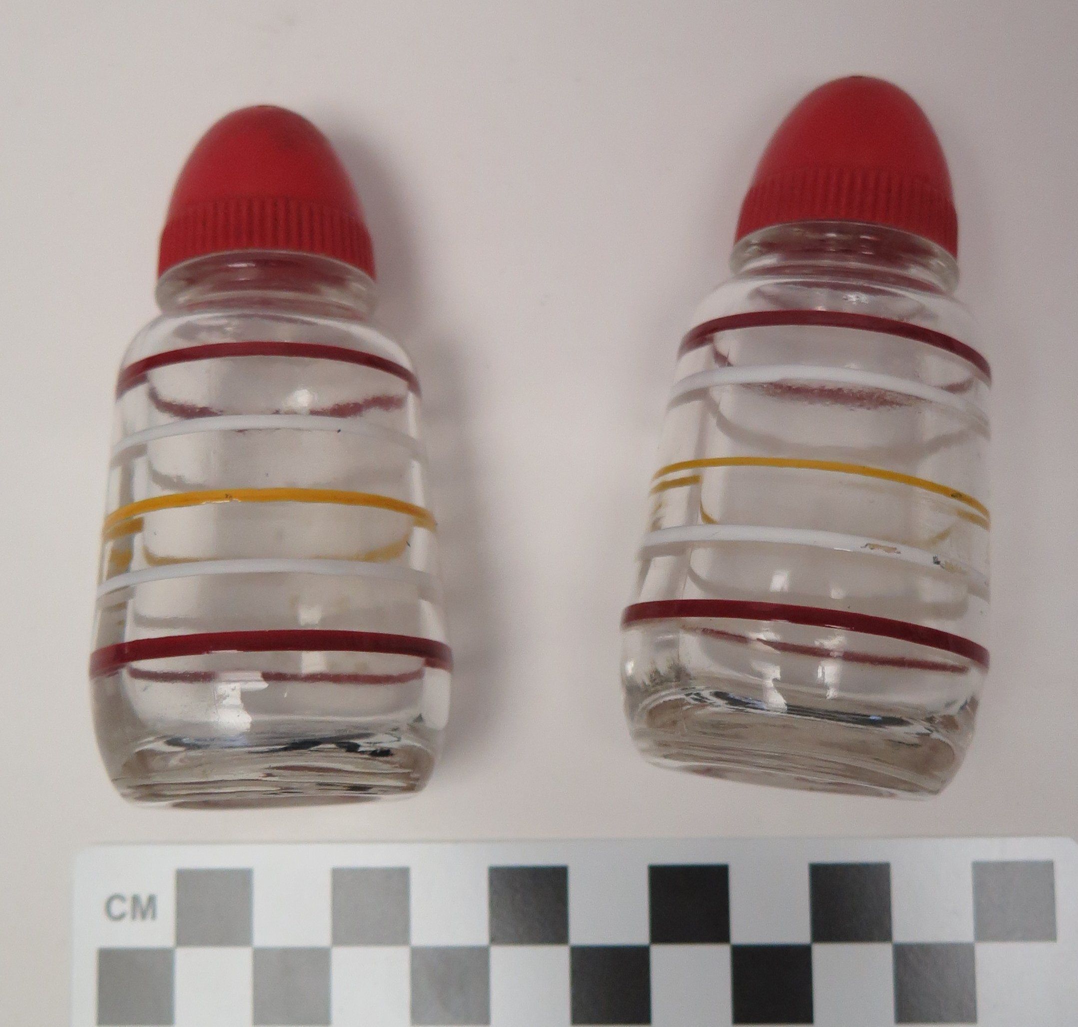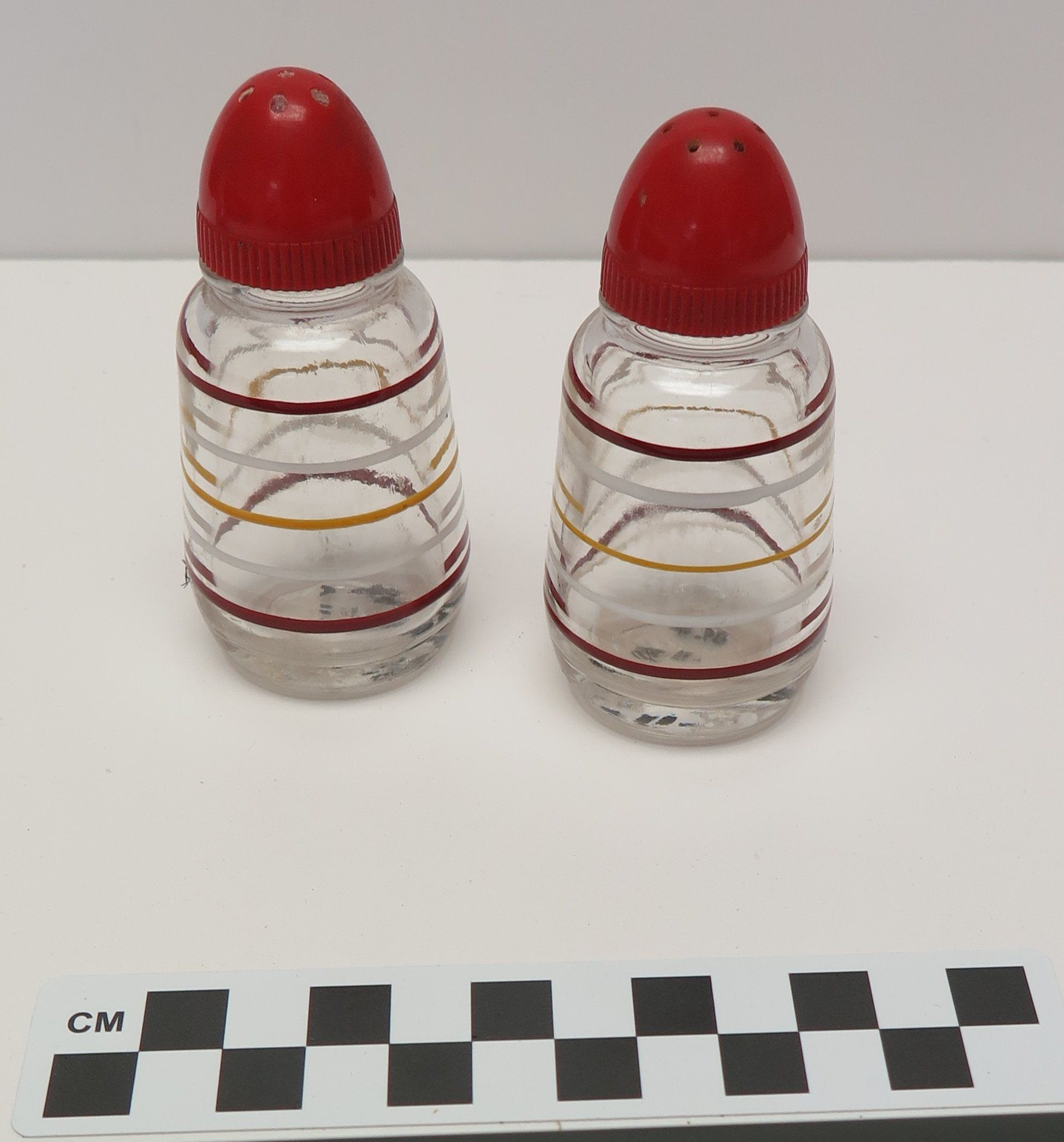 This is a glass pepper shaker with a red plastic cap and red and yellow painted bands decorating the sides of the glass. 3.25"(H) x 1.625"(Dia)Collection