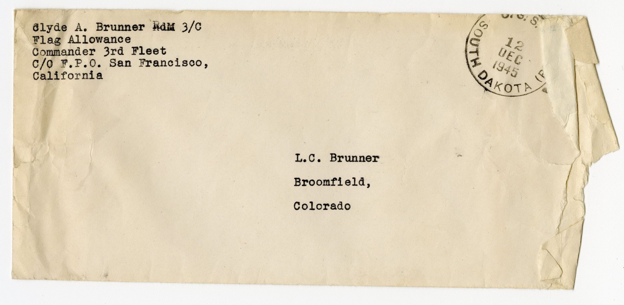 Envelope of a letter sent to Lester C Brunner from Clyde Brunner. It was sent near the end of 1945. The upper right has a stamp that has the date as the 12th of December 1945. It also has U.S.S. South Dakota written on it. The letter was sent from San Francisco, California.