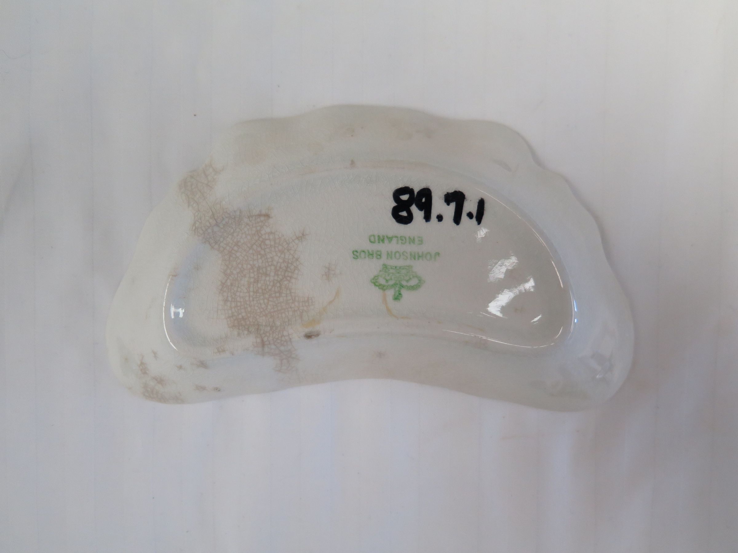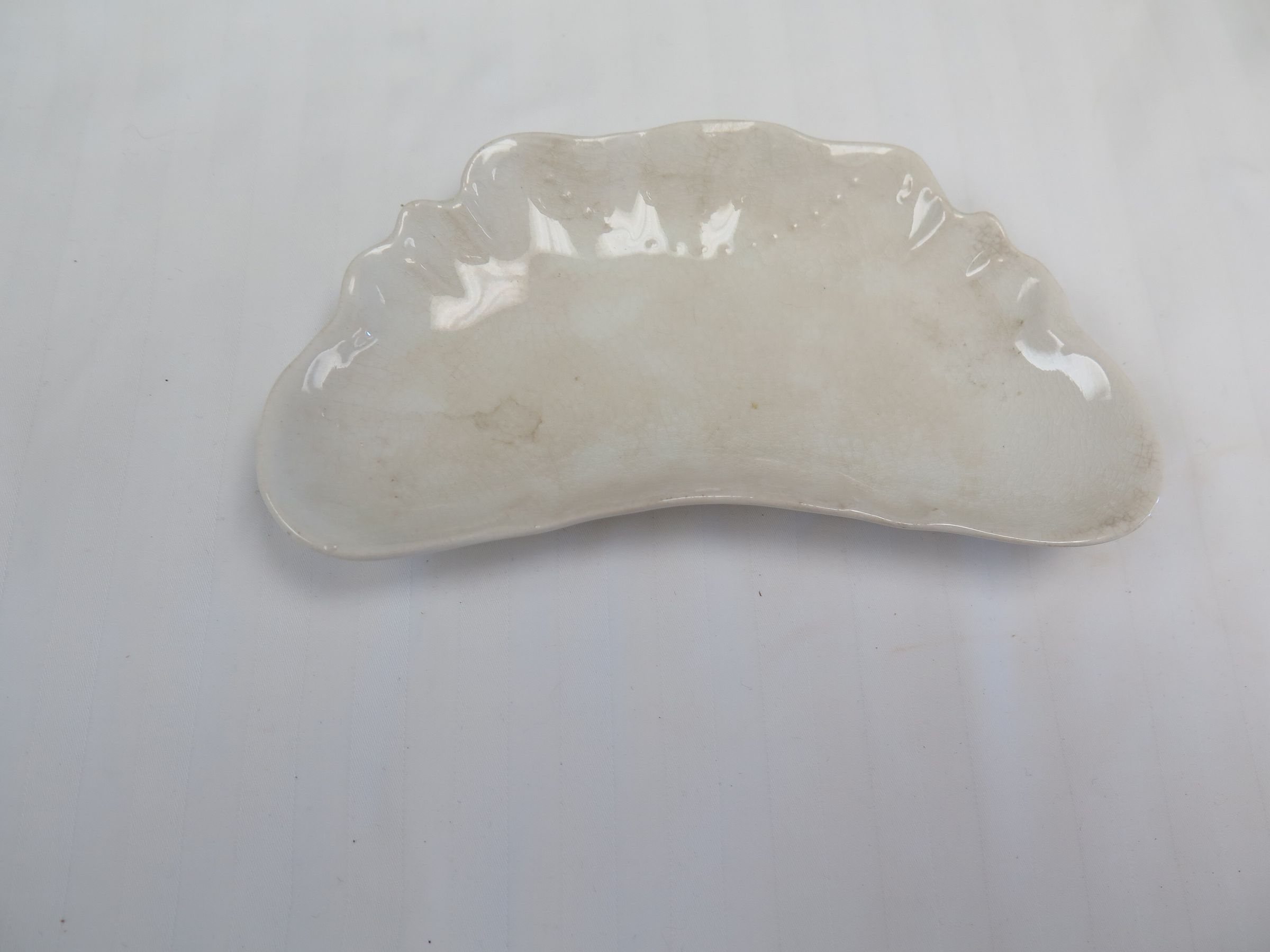 This is a white bone dish that is curved to fit around a plate. The dish has some decorative scalloped edges on the top side. The dish measures 0.5" (h) x 3.5" (w) x 6" (l).