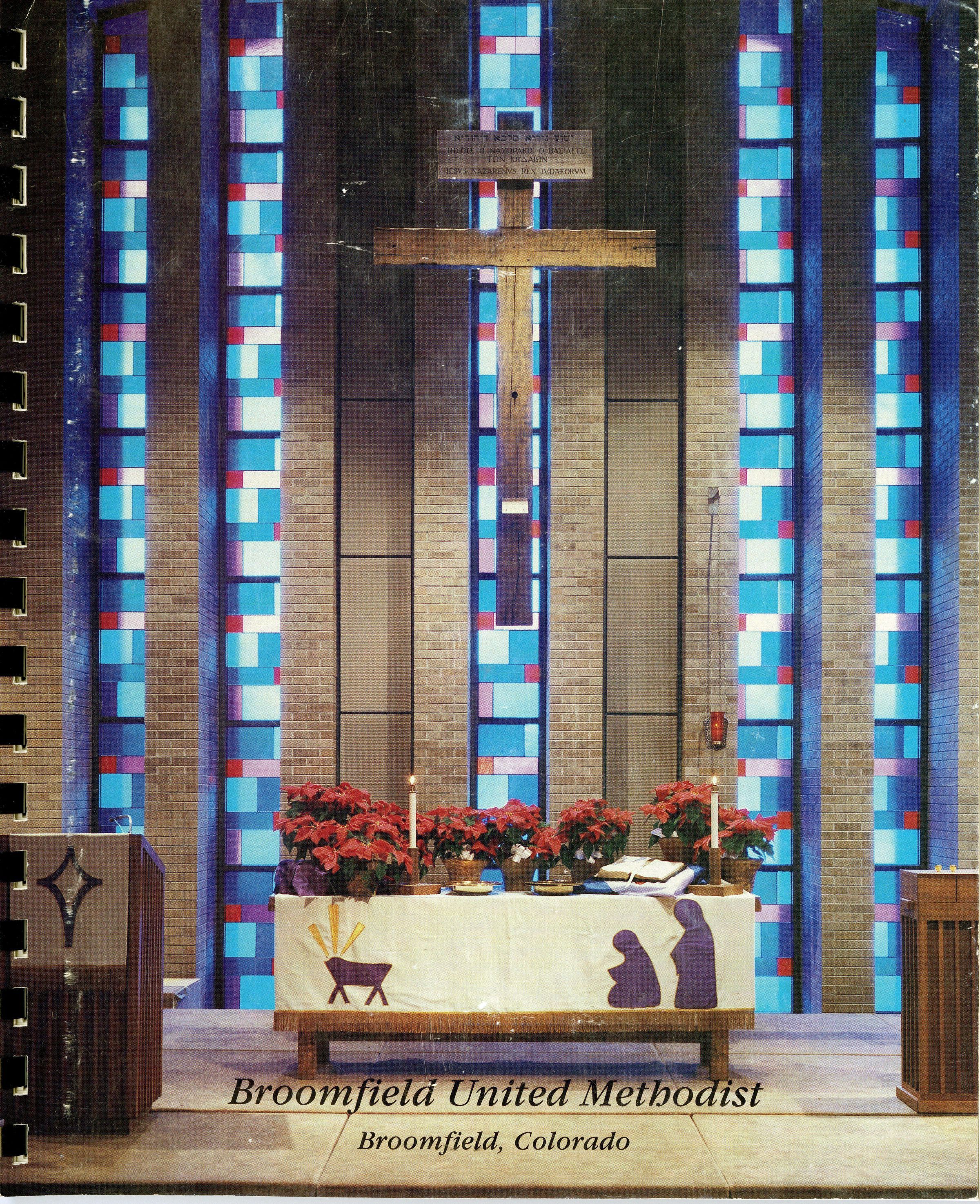 The cover features an image of the inside of the church. There is a cross suspended in the air, as well as a table with several poinsettia plants, two candles, a book, and a few dishes. On the bottom of the cover, it reads "Broomfield United Methodist. Broomfield, Colorado."
