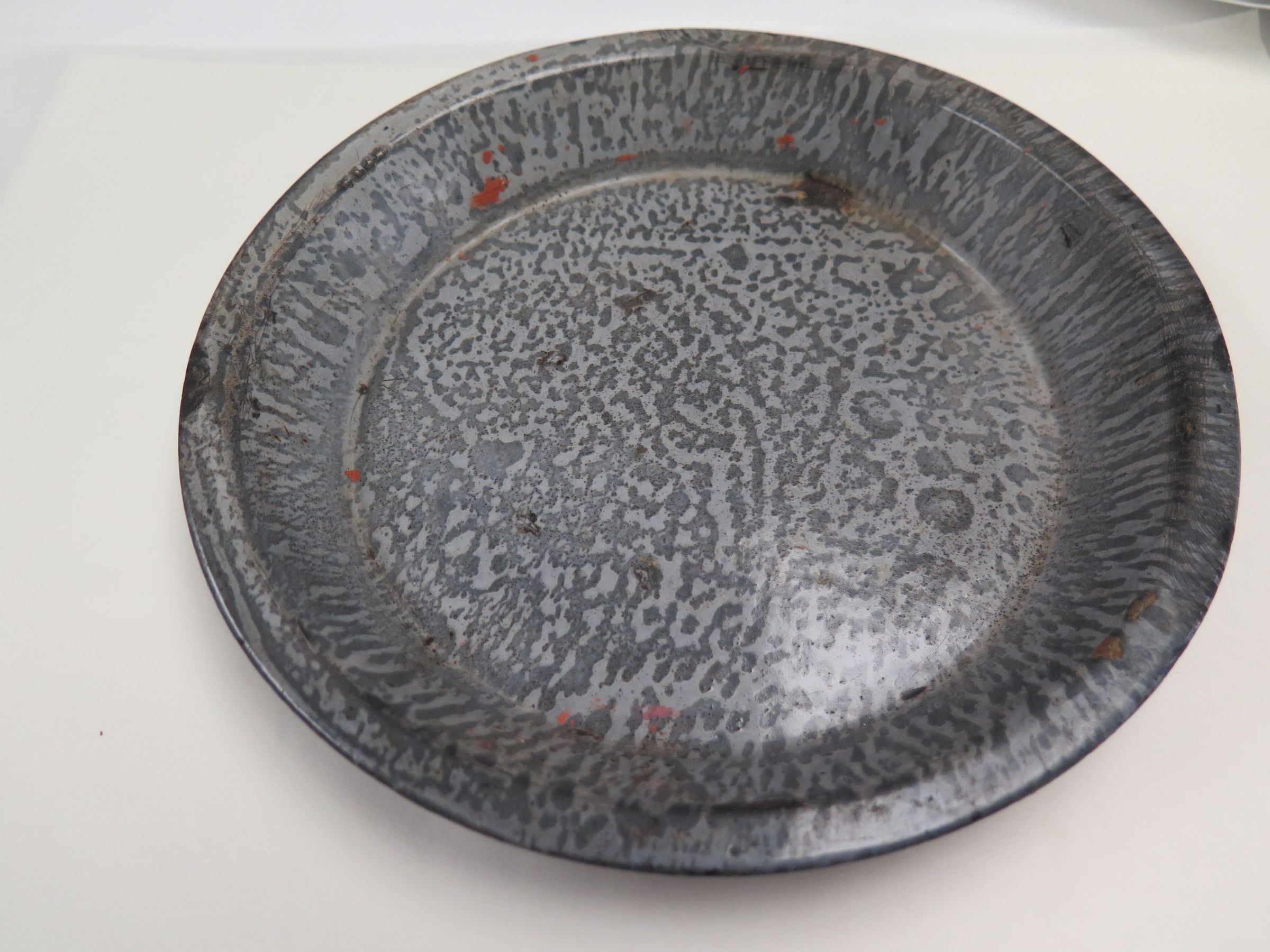 This is a round, grey granite pie tin. The pie tin measures 1.75" (h) x 9.75" (dia).