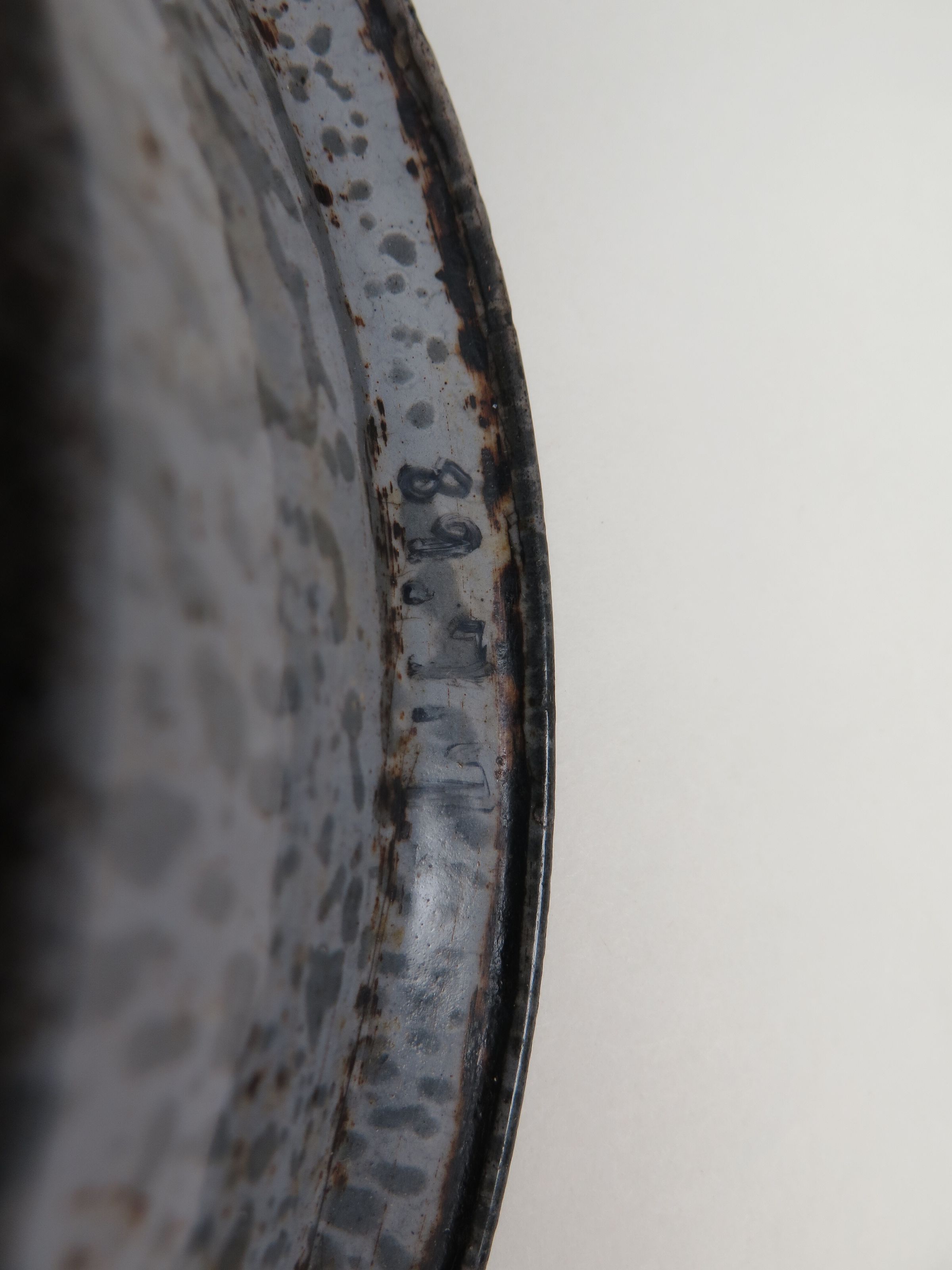 Top of pie pan: Origsize: 1.75" (h) x 9.75" (d; Origformat: Artifact