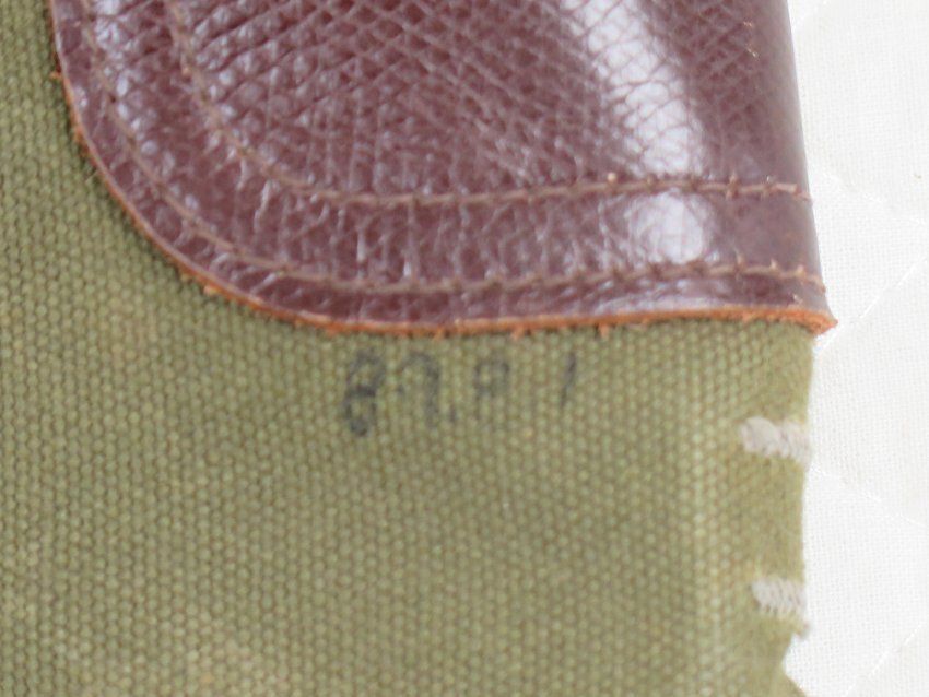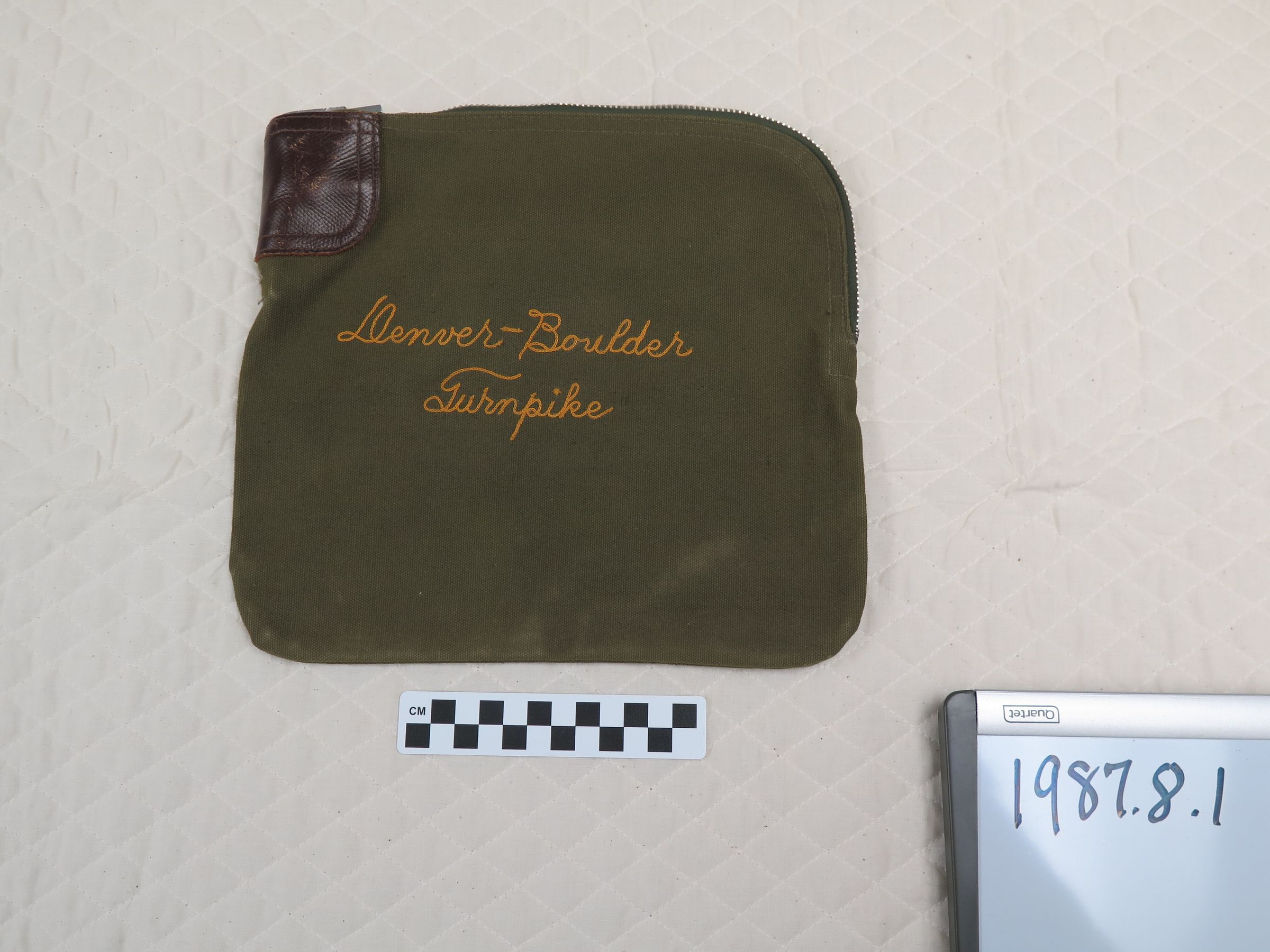 This is a green canvas money bag with a zipper across the top. On the front of the bag, the text "Denver-Boulder Turnpike" has been embroidered with yellow thread. In the top left corner of the bag is a 5" x 2.5" piece of leather that wraps around the side of the bag. The bag measures 10.5" (w) x 9.5" (l) x 1" (d).