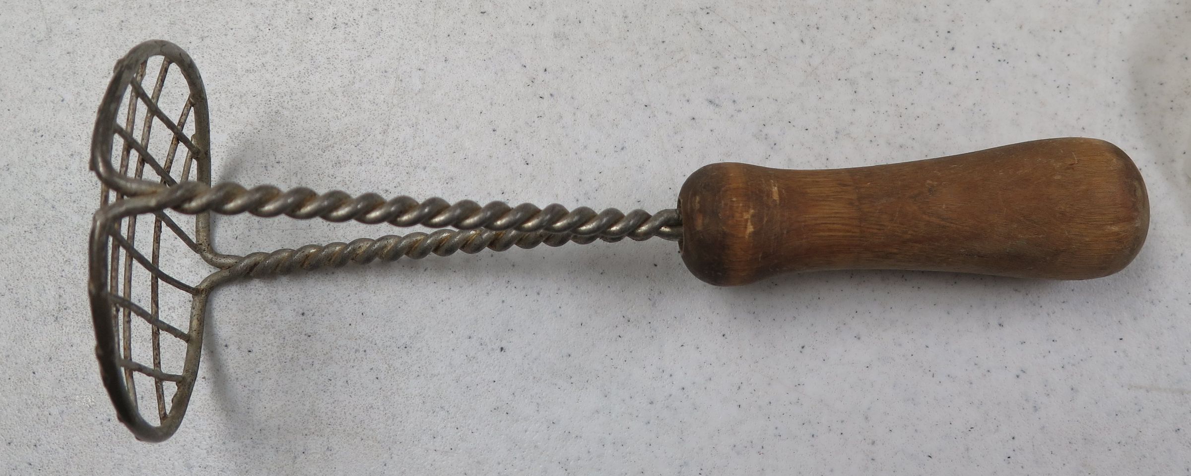This is a twised wire potato masher with an unpainted turned wooden handle. 9"(L) x 3.5"(Dia)