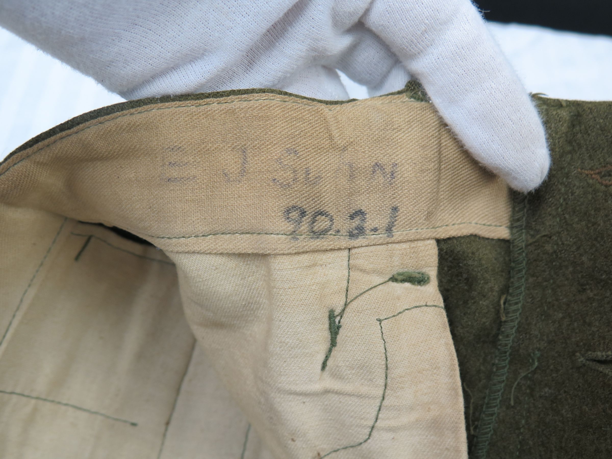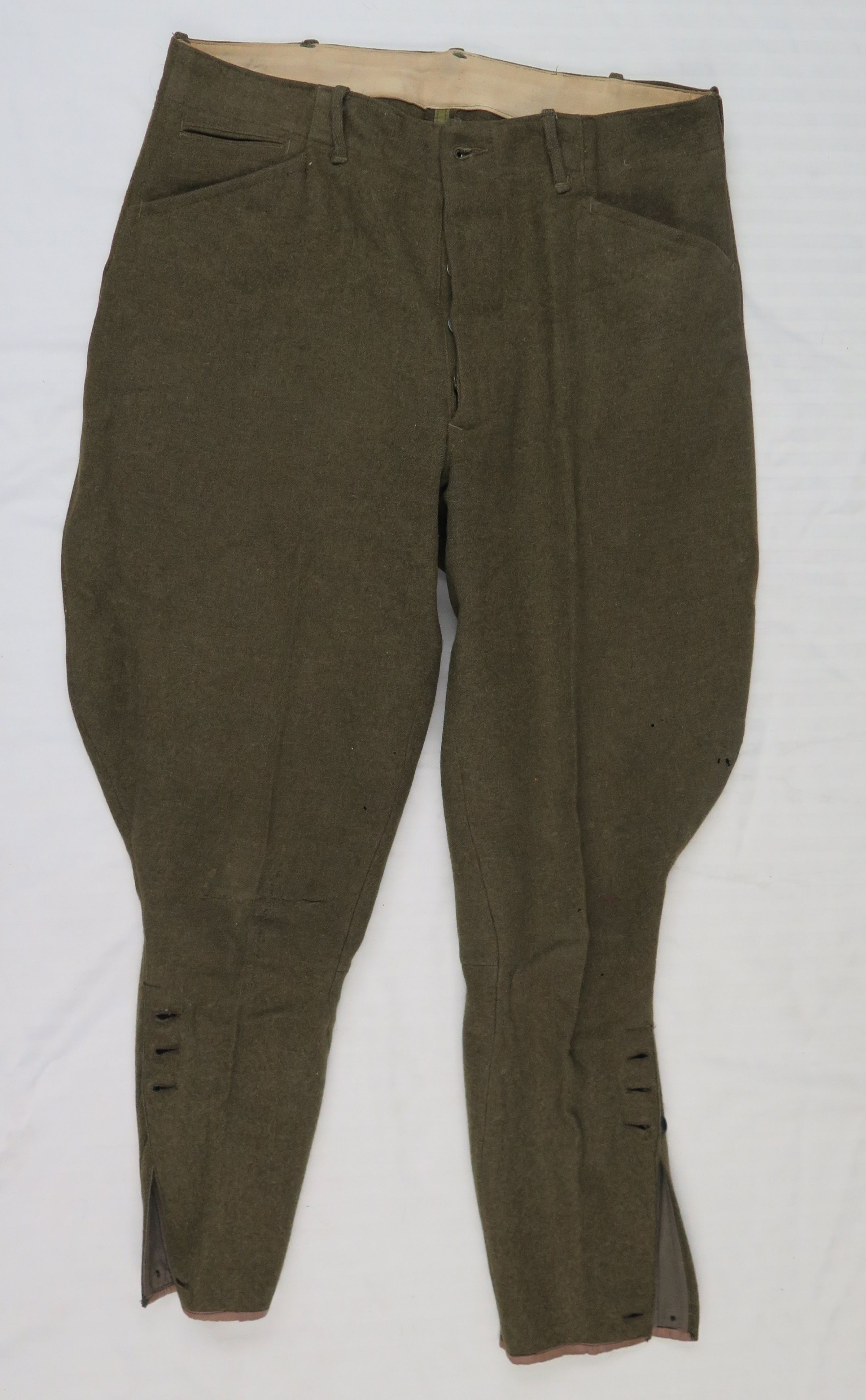 This is an olive green men's jodhpur pants from a WWI uniform. Written inside the waist band is "E. J. Suhn." Jodhpur pants measure 16" (w) x 36" (l).