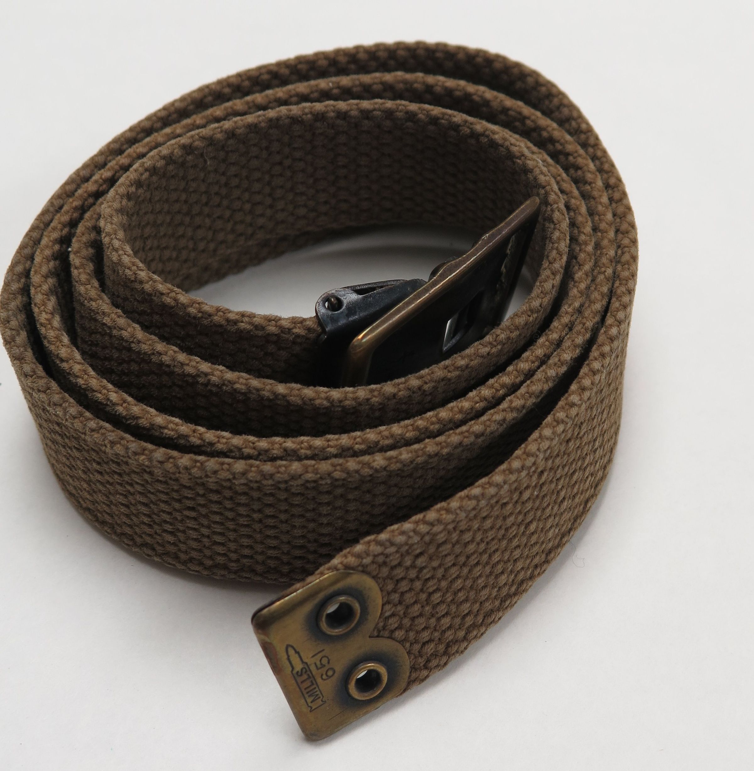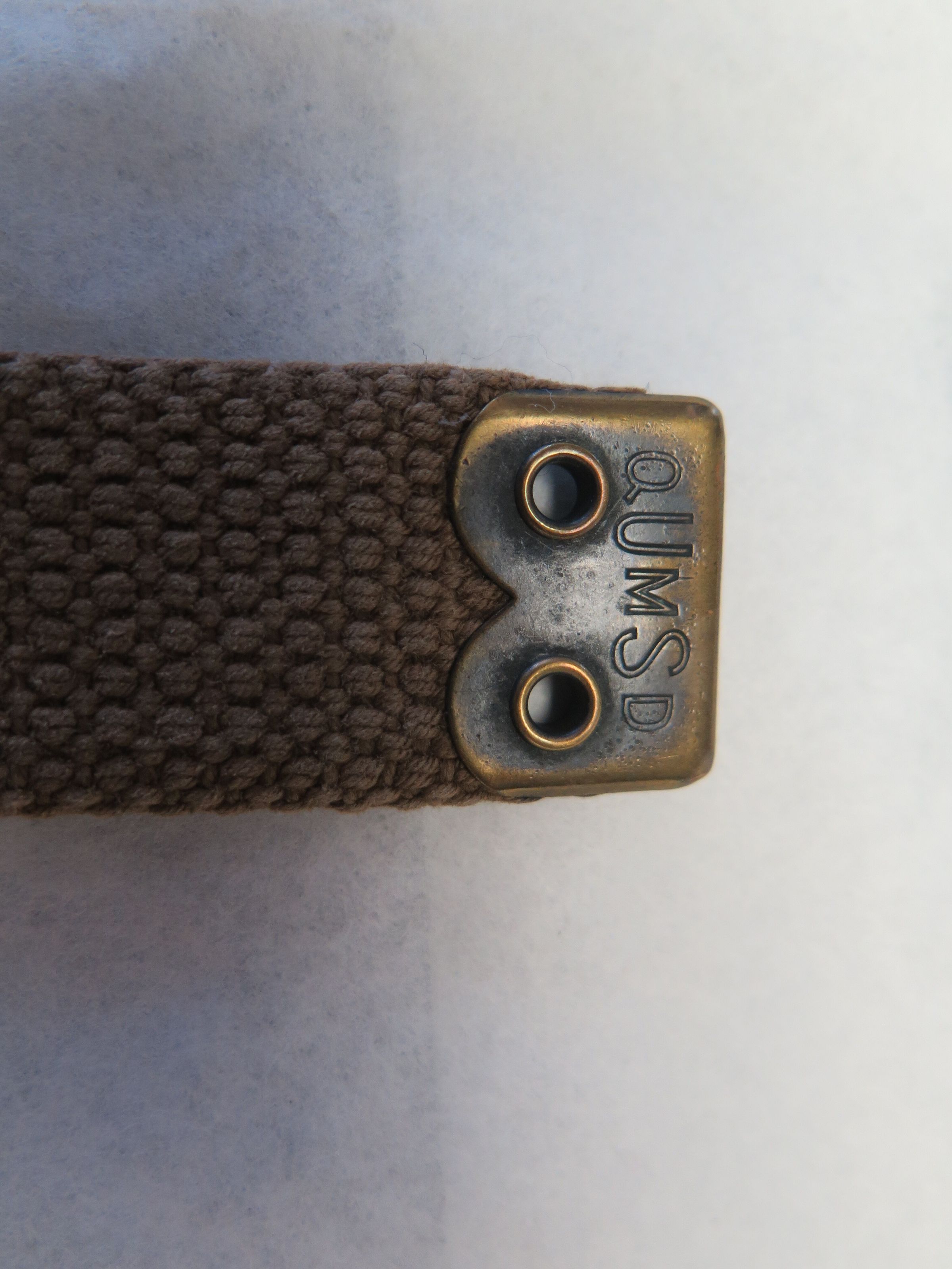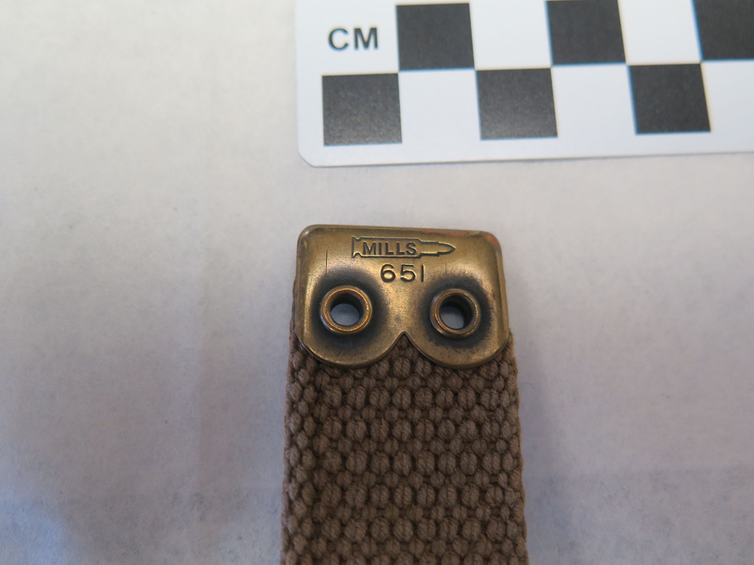 This woven kahki-colored belt measures 1"(W) x 40"(L). It has a metal buckle and metal end/tip. There is also a patent date of January 12, 1904. The buckle is marked "Anchor Brand/PAT. JAN 12.04" and has a maker's mark of an anchor. The tip is marked with the text "MILLS" inside the outline of a cartridge. The number 651 is below. The back of the tip is marked "QUMSD," which stands for United States Quarter Master Depot.