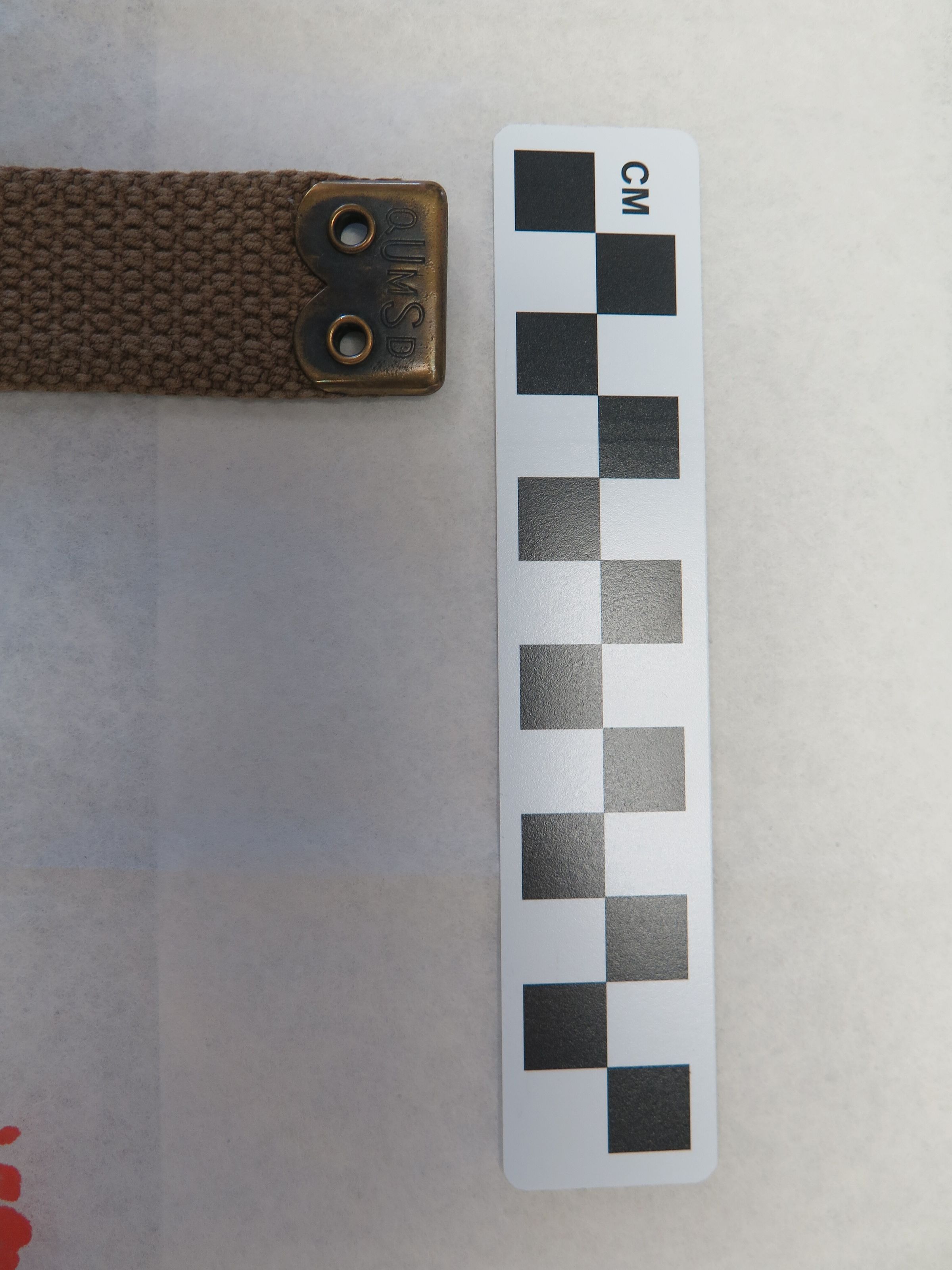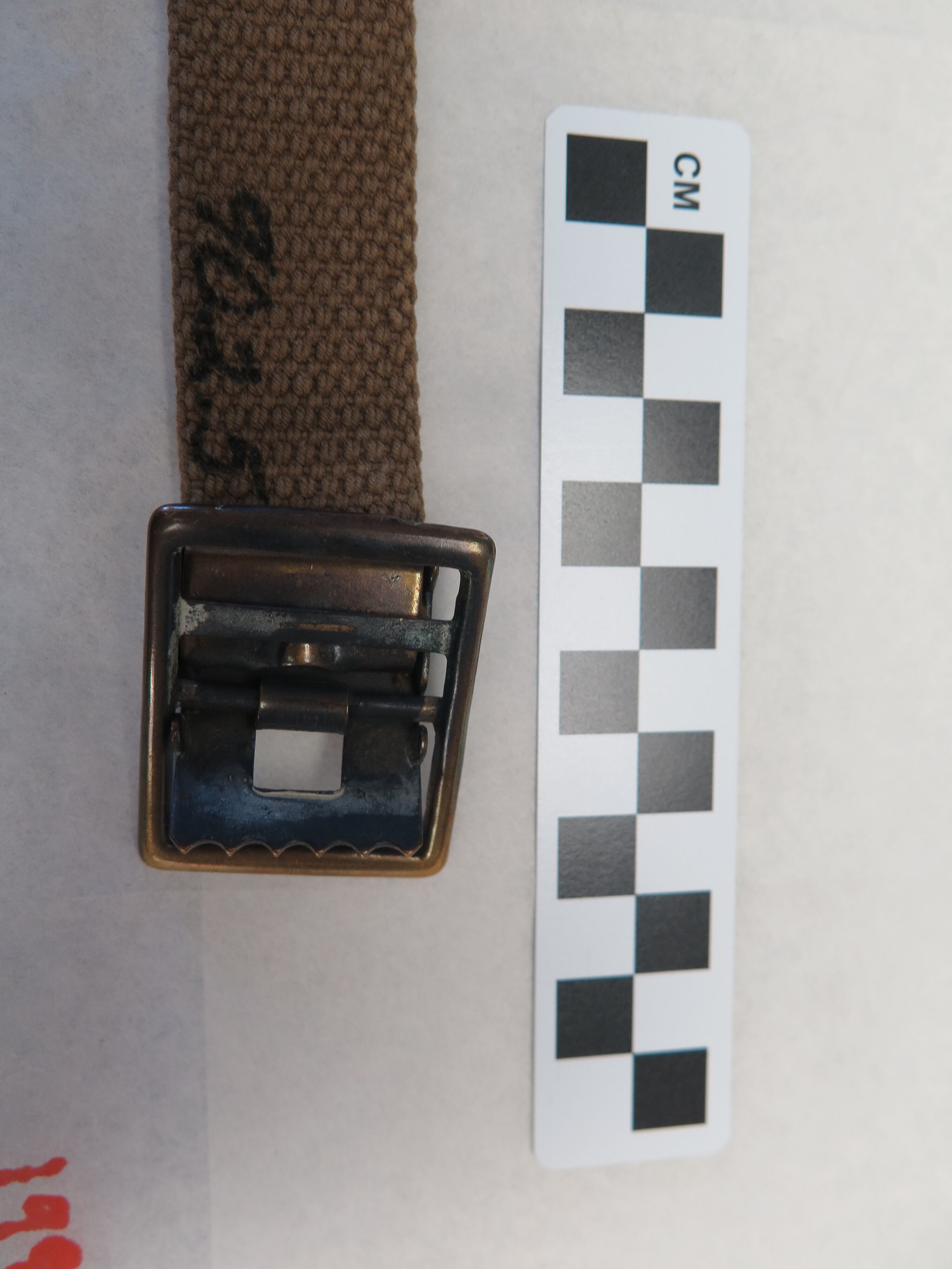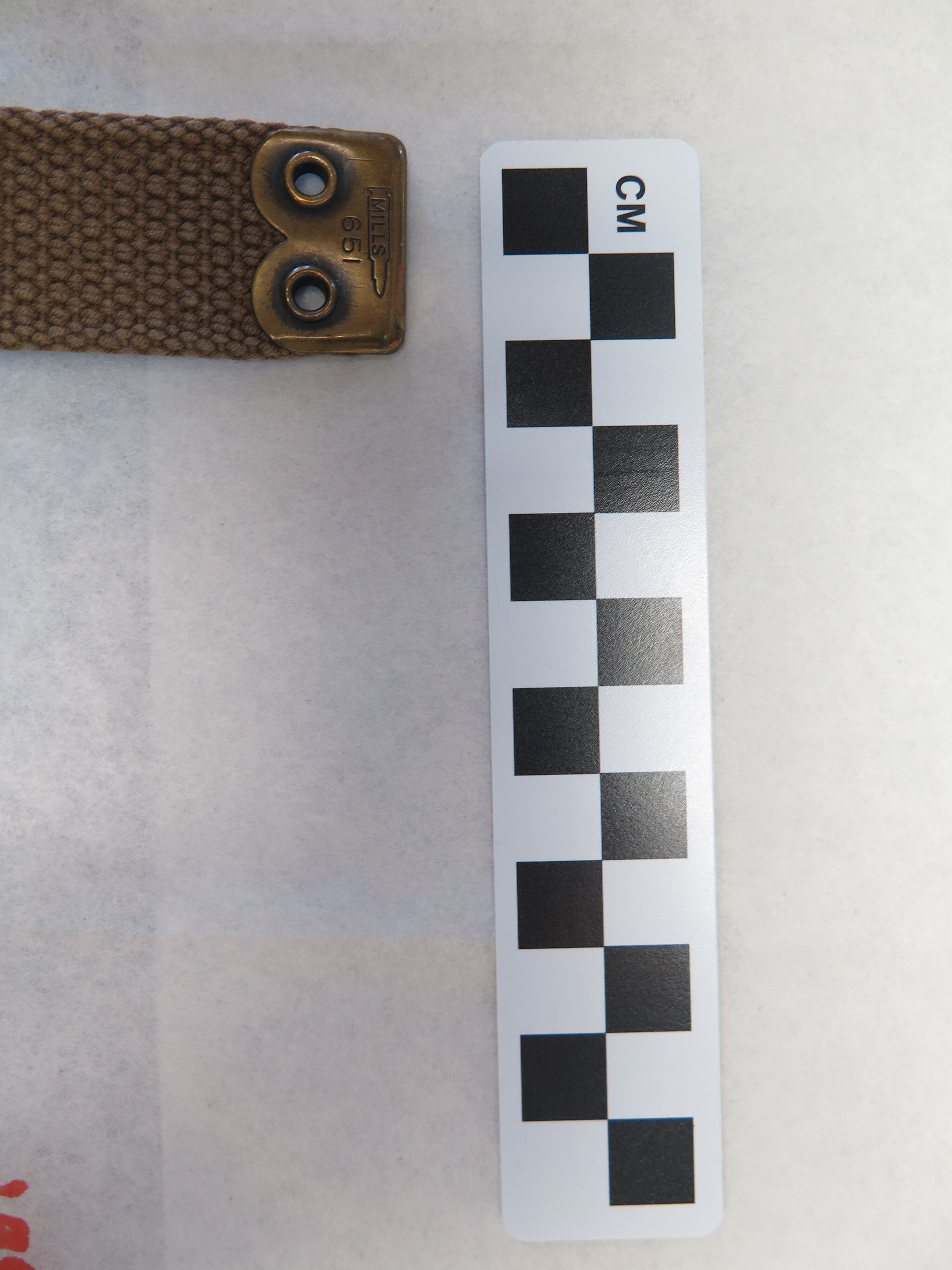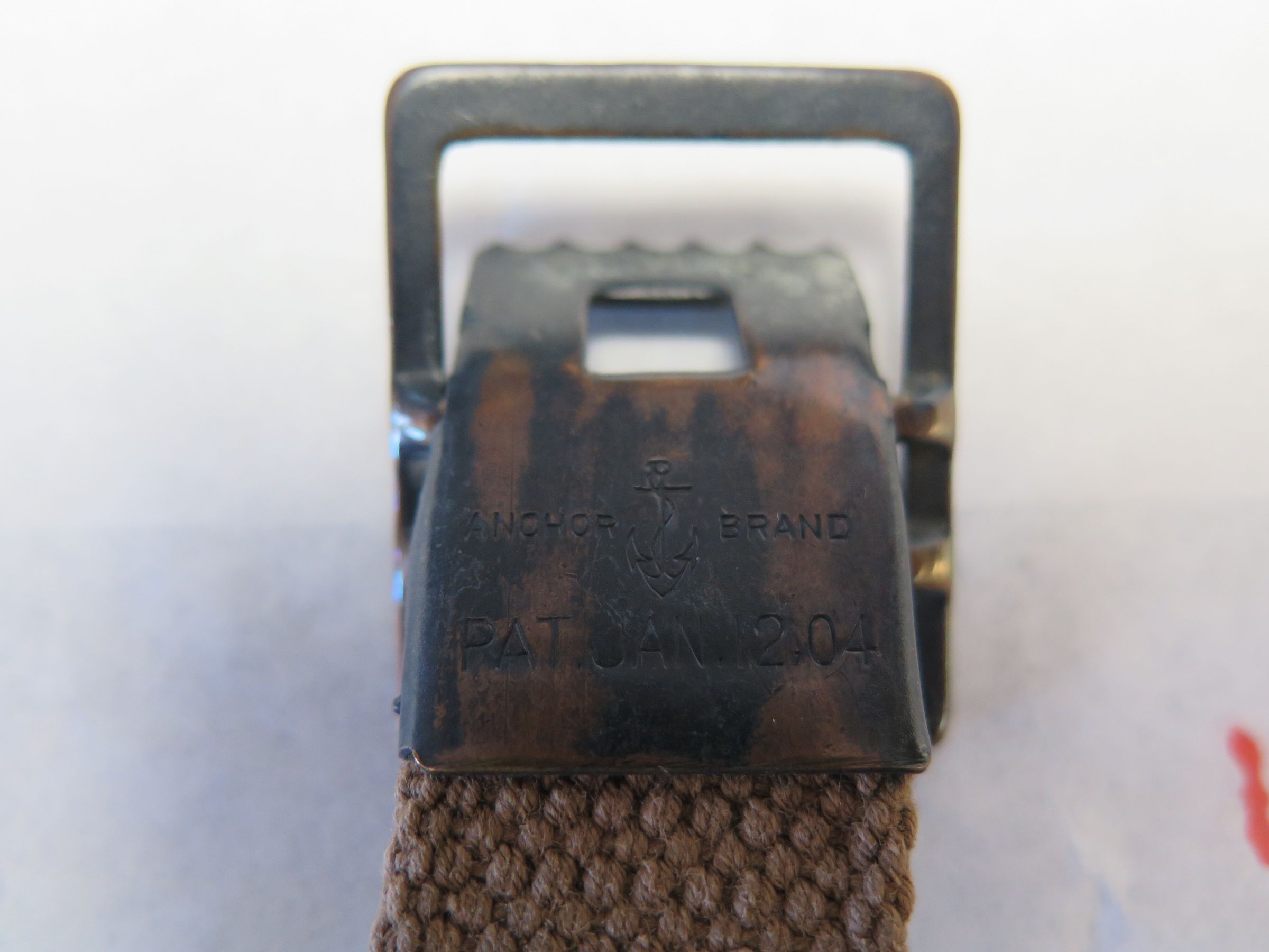 This woven kahki-colored belt measures 1"(W) x 40"(L). It has a metal buckle and metal end/tip. There is also a patent date of January 12, 1904. The buckle is marked "Anchor Brand/PAT. JAN 12.04" and has a maker's mark of an anchor. The tip is marked with the text "MILLS" inside the outline of a cartridge. The number 651 is below. The back of the tip is marked "QUMSD," which stands for United States Quarter Master Depot.