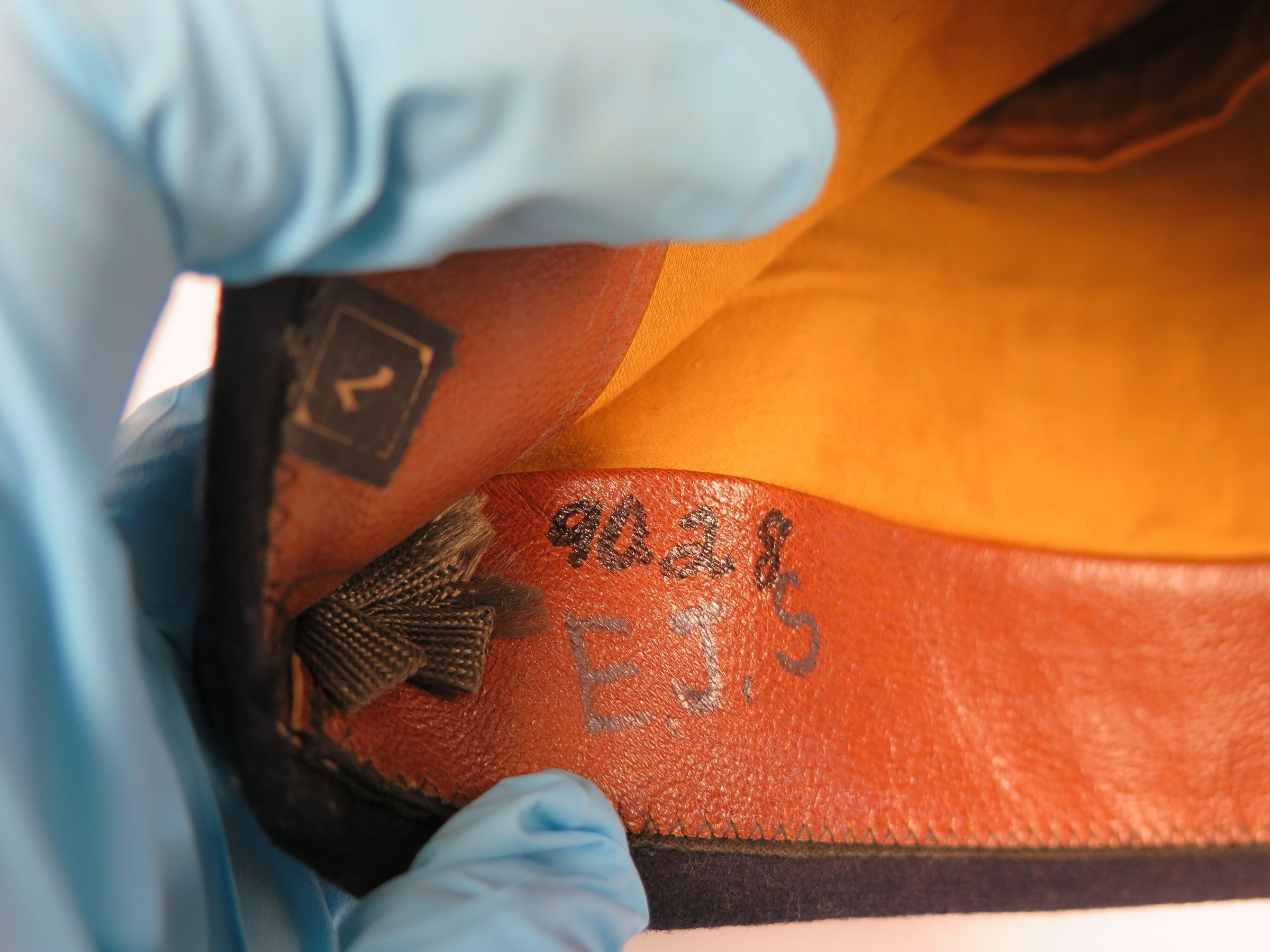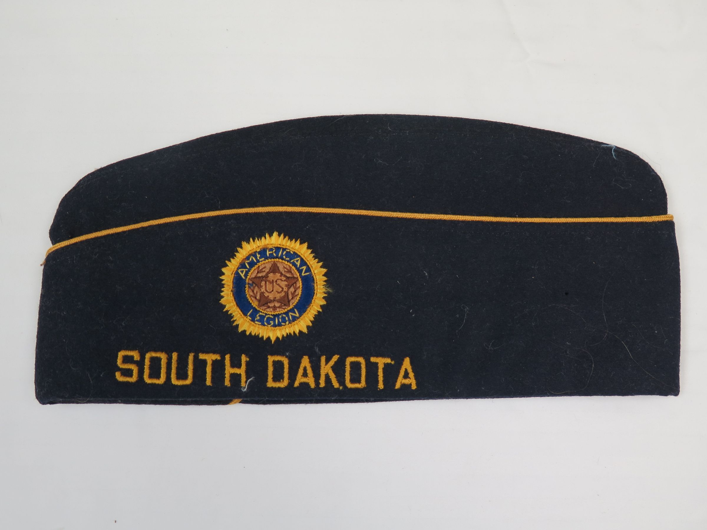 This is a WWI uniform cap from "American Legion" in South Dakota. American Legion Cap from South Dakota of black coloring. Initials E.J.S. written inside of the cap. South Dakota embroidered in a gold thread at the bottom of the front of the hat with a symbol above it. The symbol is the shape of a circle with a reddish inside, blue border and gold edging. The reddish circle has a 5 pointed star that reads US. There is the appearance of leaves around the star. The blue edging reads American Legion in gold thread. The gold trimming is done in a zigzag pattern. Cap measures 5" (w) x 11" (l).