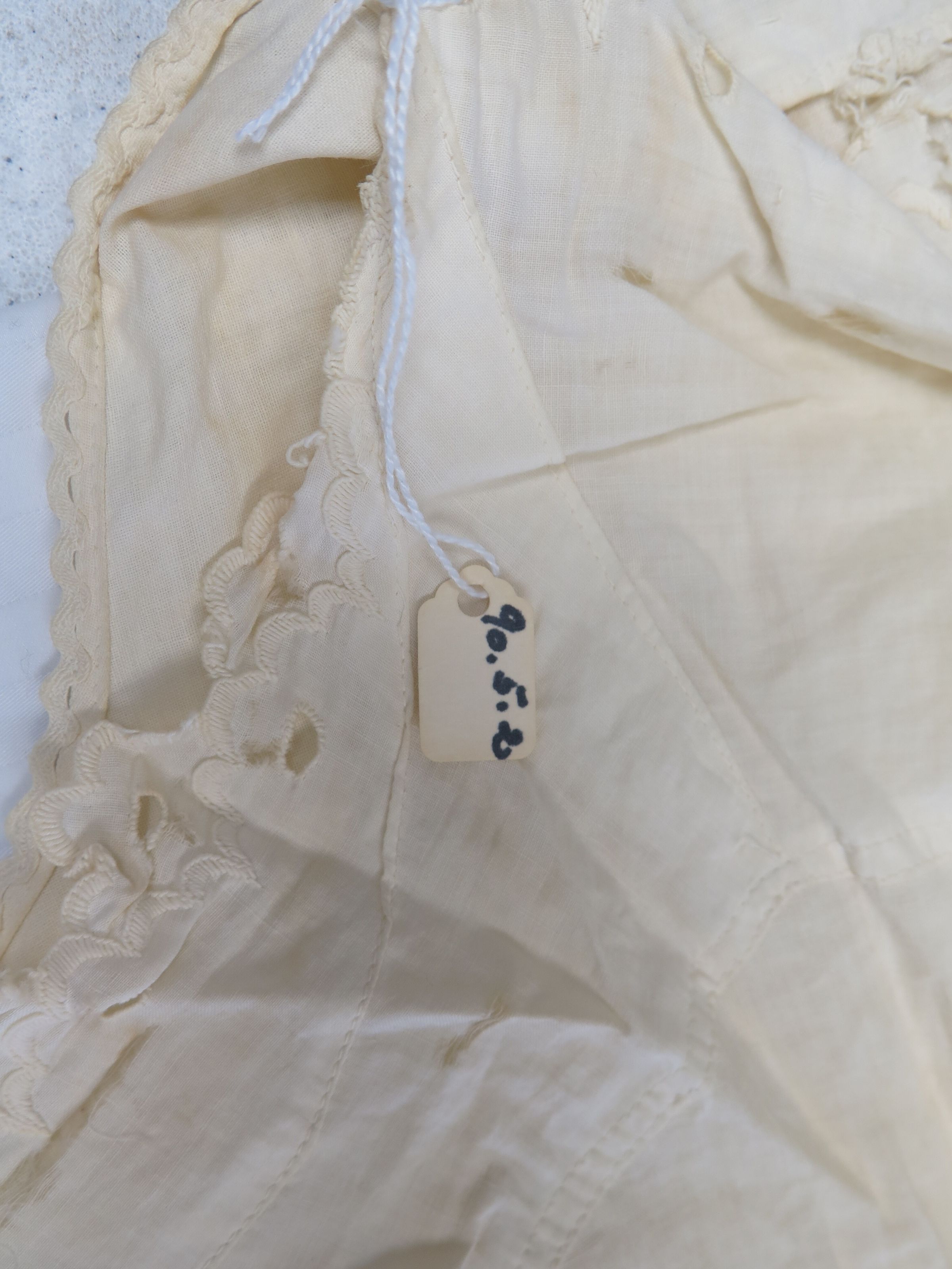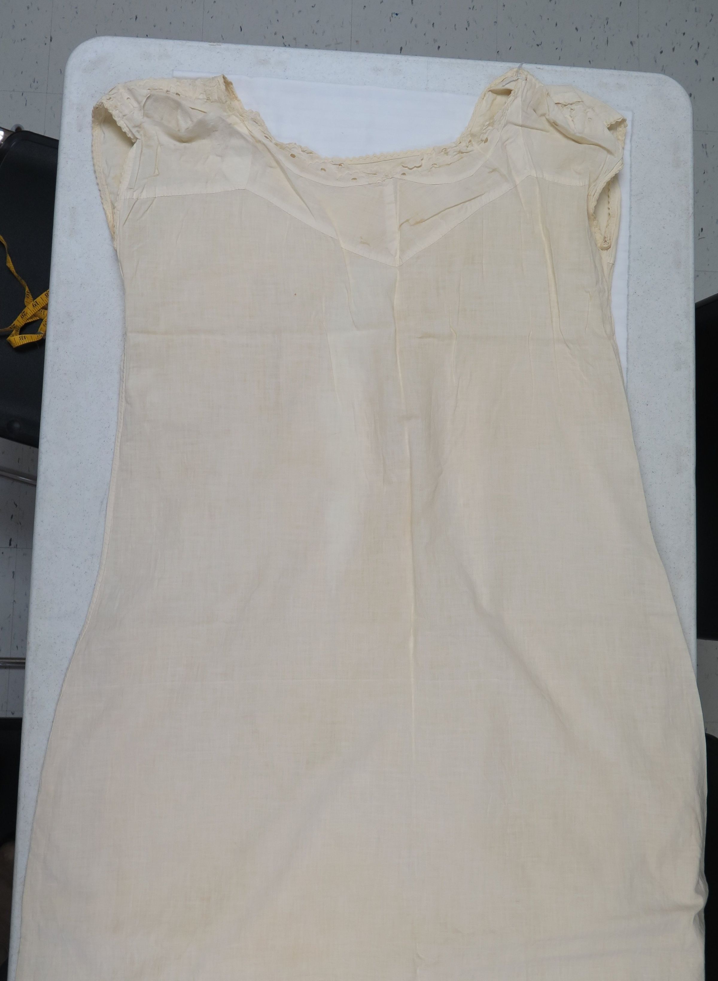 This is a cream colored cotton nightgown with eyelet trim. The nightgown has been repaired many times. The nightgown measures 32" (w) x 45" (l).