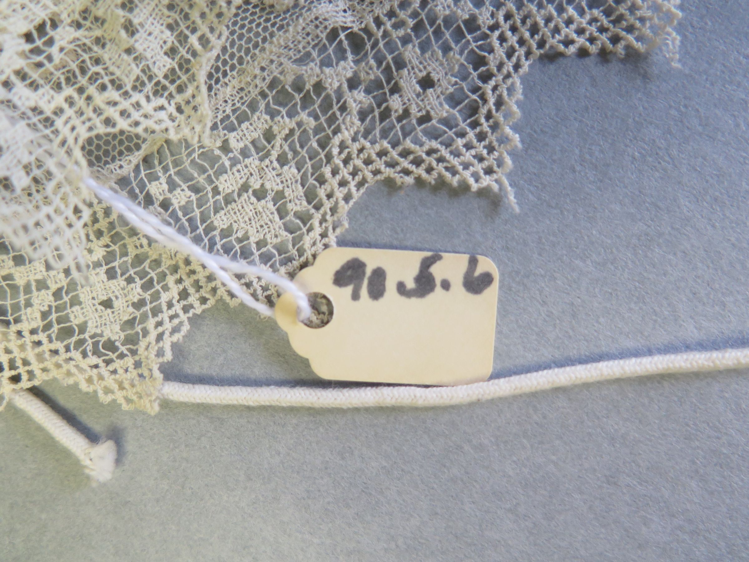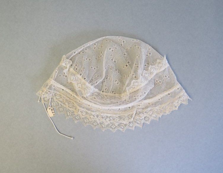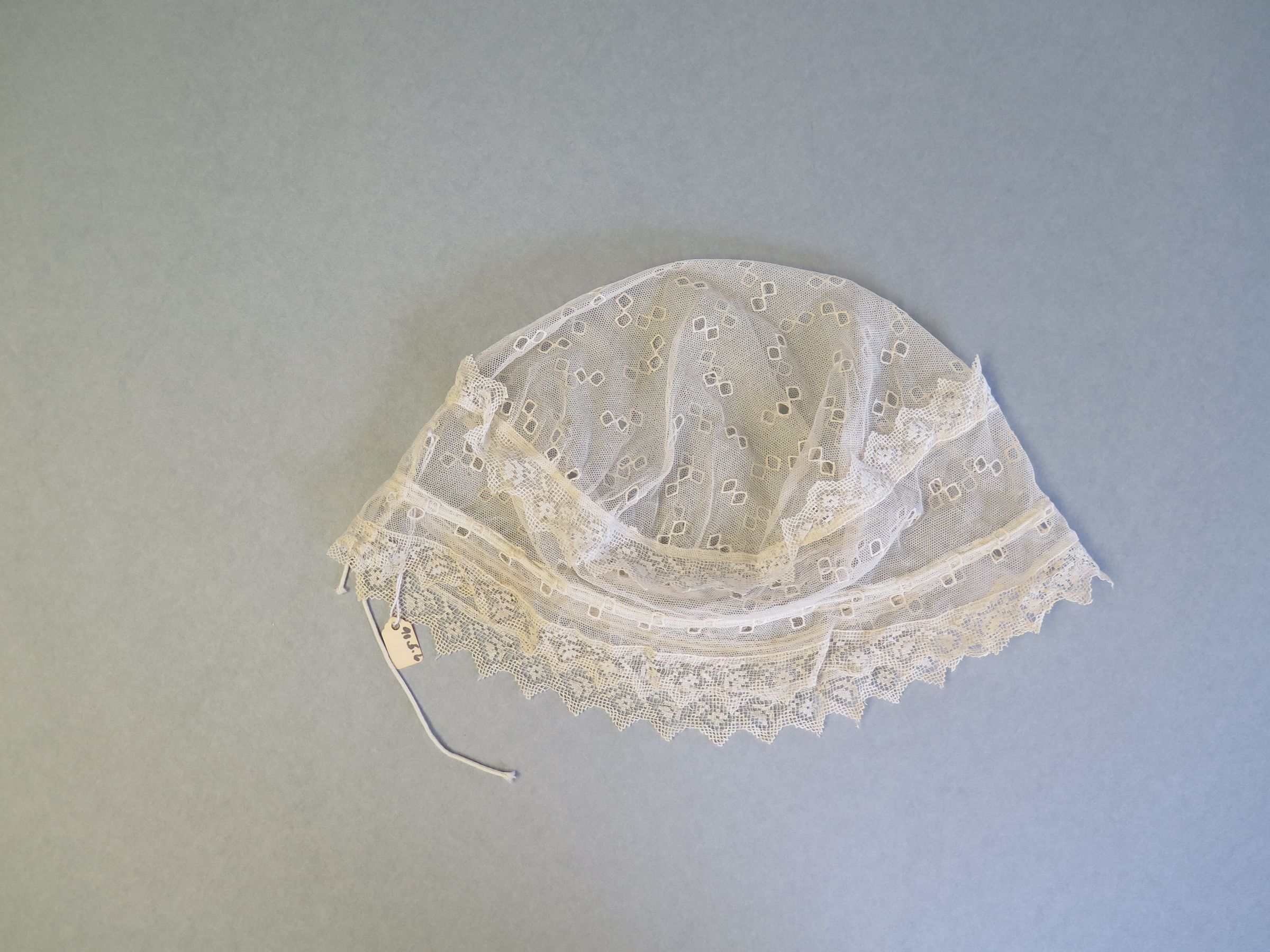 White net lace dust cap. The cap has scalloped edges. The cap measures 9" (w) x 13" (l).