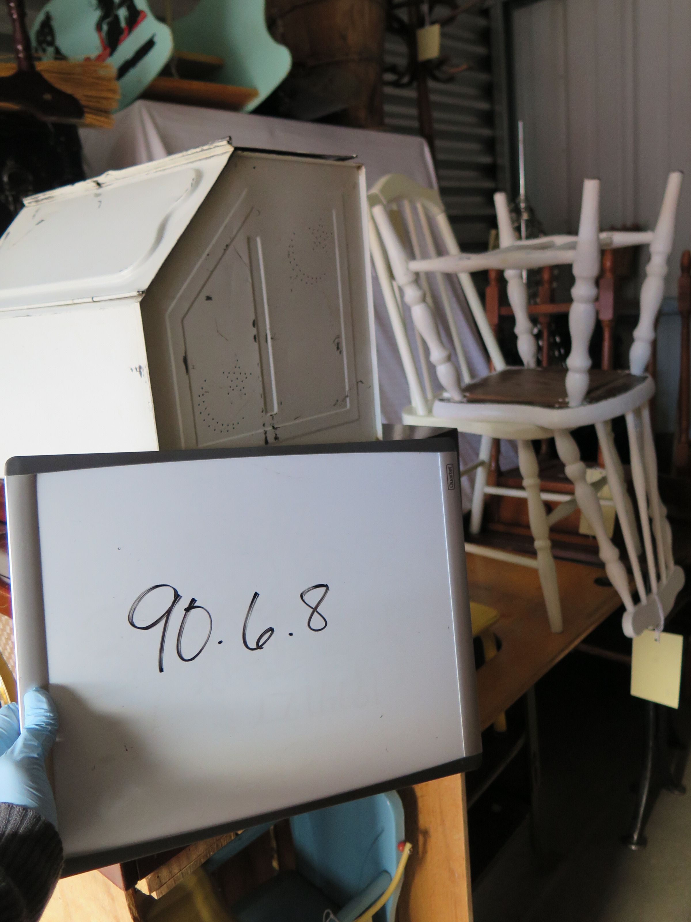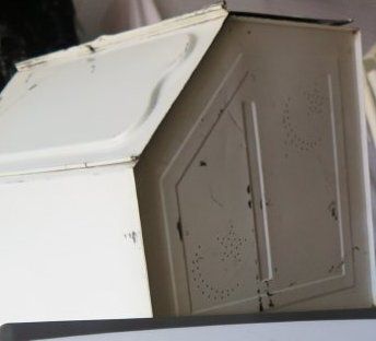 This is a white tin bread box. The box measures 10.5" (h) x 13.75" (w) x 11" (d).